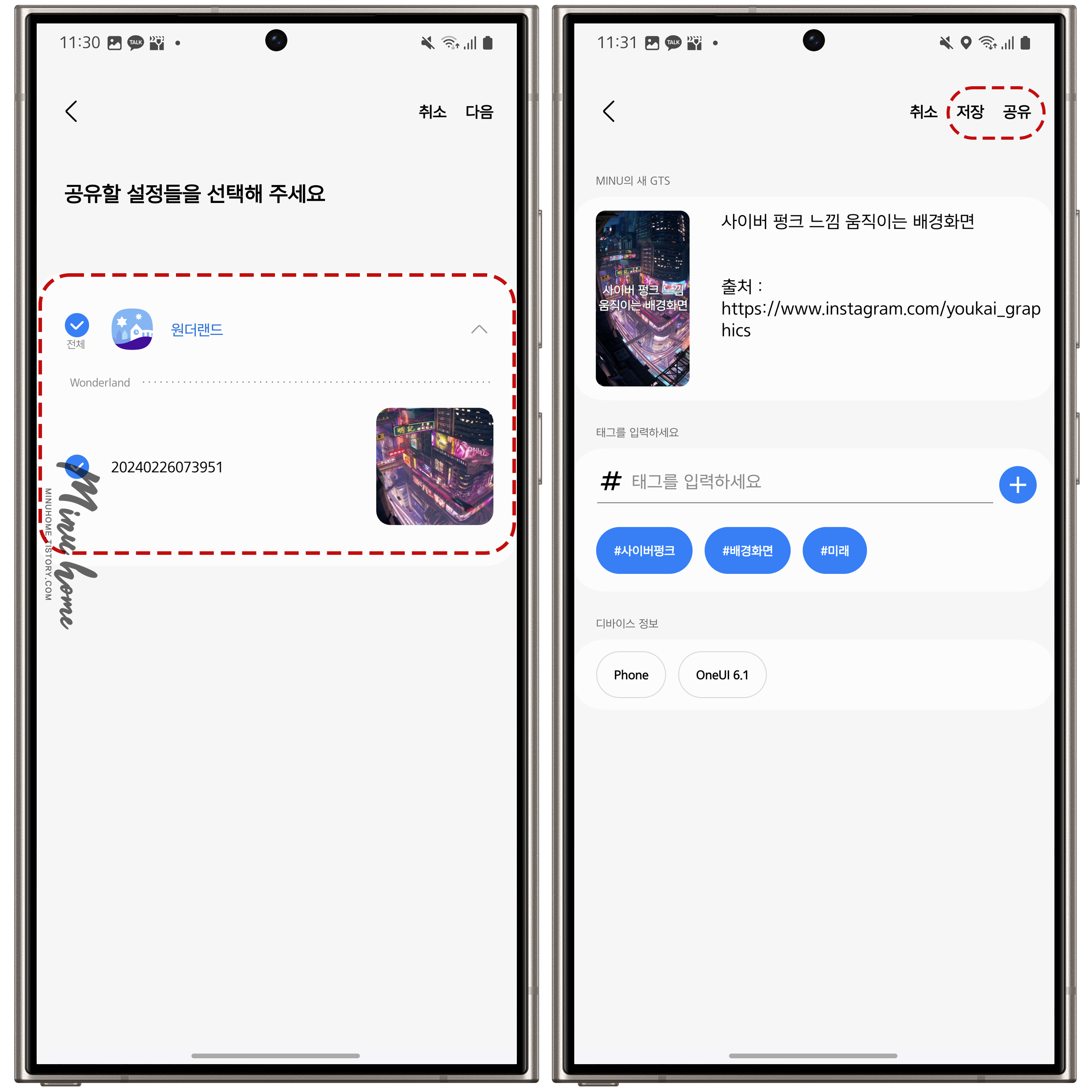 이렇게 설정을 하고 내가 공유하고자 하는 굿락 항목에 "원더랜드"를 선택하고 다음올 이동 후 썸네일과 내가 공유하고자 하는 굿락 설정을 소개란에 적고 태그와 함께 "저장" 혹은 "공유"를 선택하여 갤럭시 사용자에게 전달할 수 있습니다.