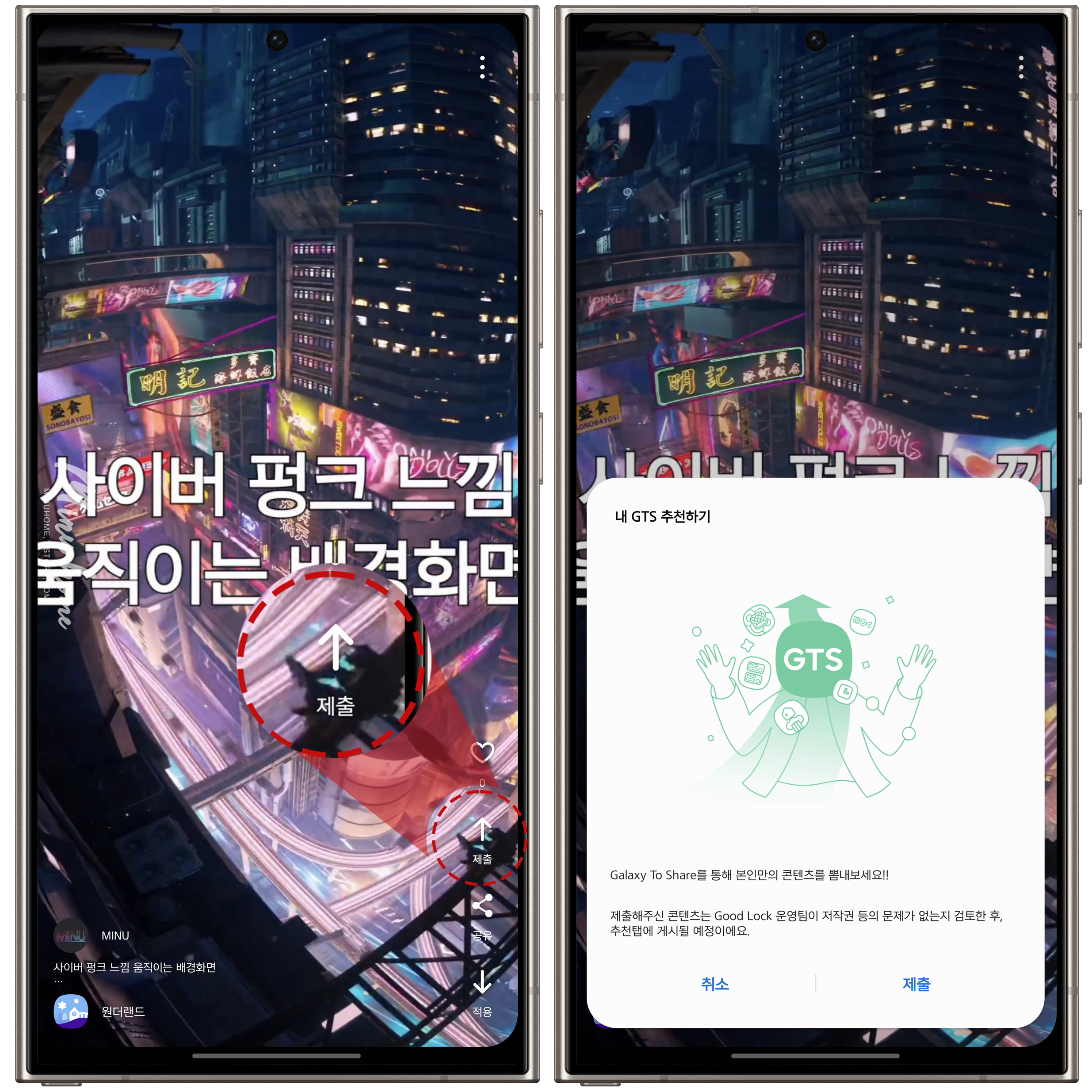 해당 제출 버튼은 GTS 서버에 등록해서 담당자의 승인을 받으면 추천 GTS 혹은 검색을 통해 내가 제출한 GTS를 검색하여 다른 갤럭시 사용자가 적용하여 쓸 수 있습니다.
