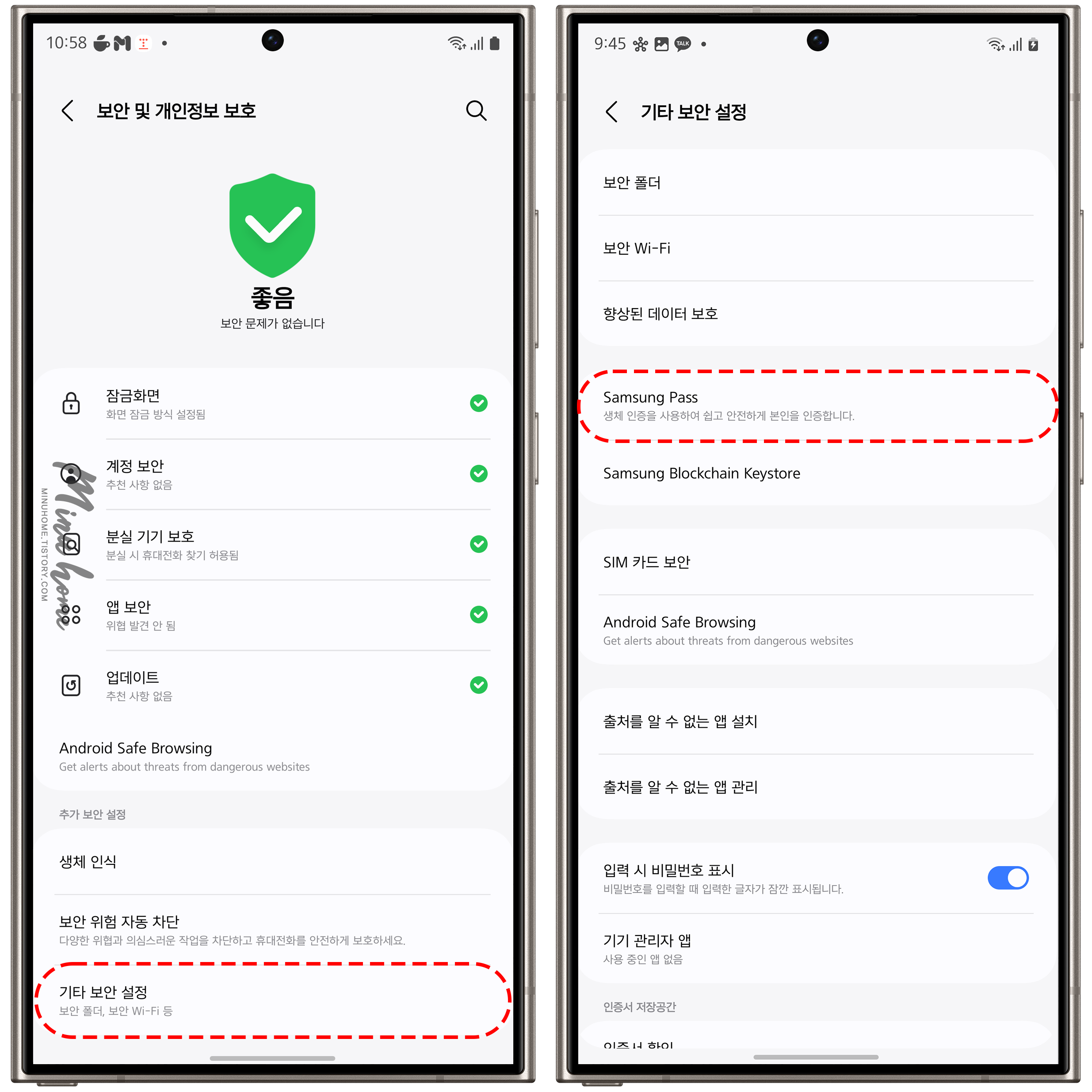 삼성패스 메뉴 진입 방법은 설정 - 보안 및 개인정보 보호에서 기타 보안 설정 메뉴의 삼성패스 메뉴로 이동하시거나