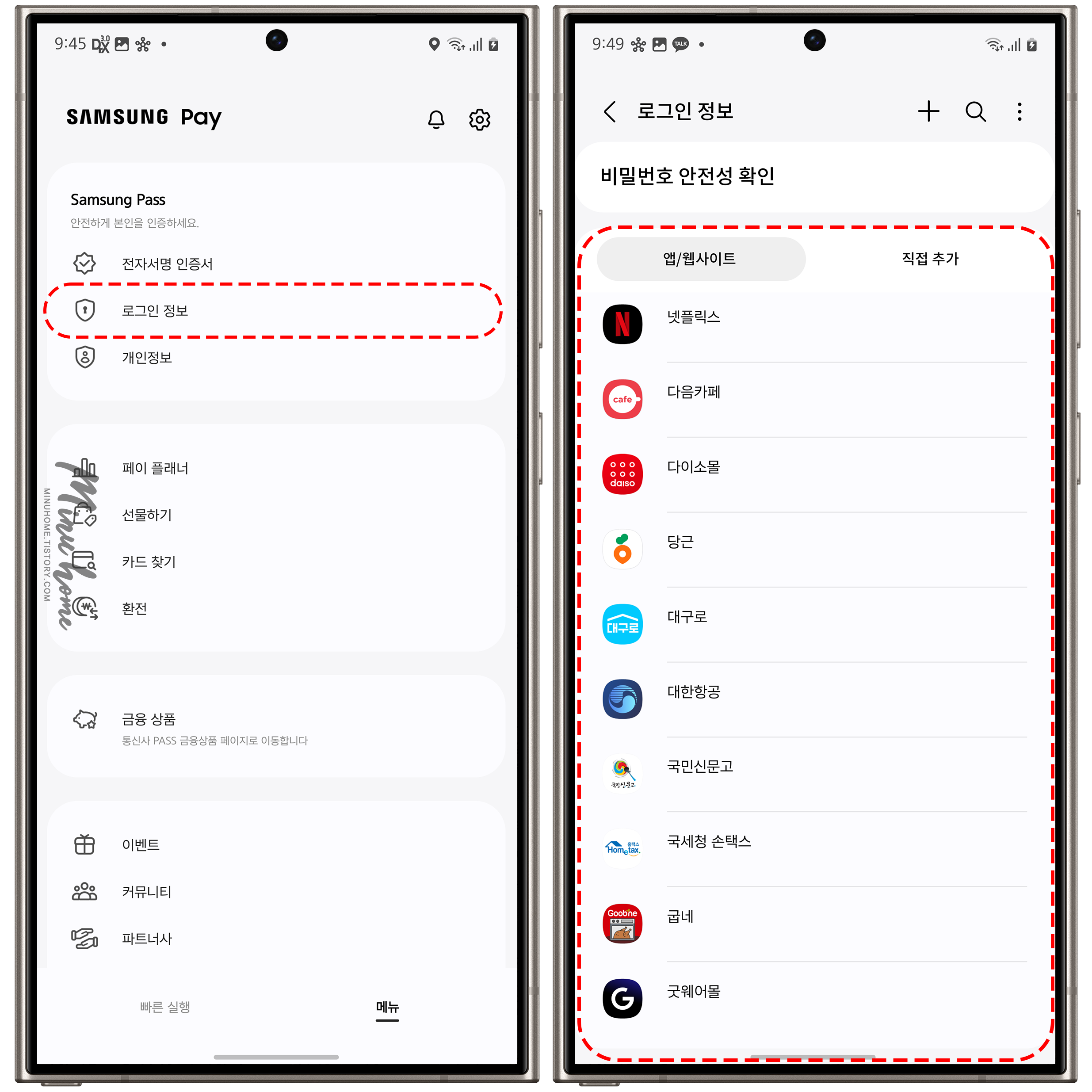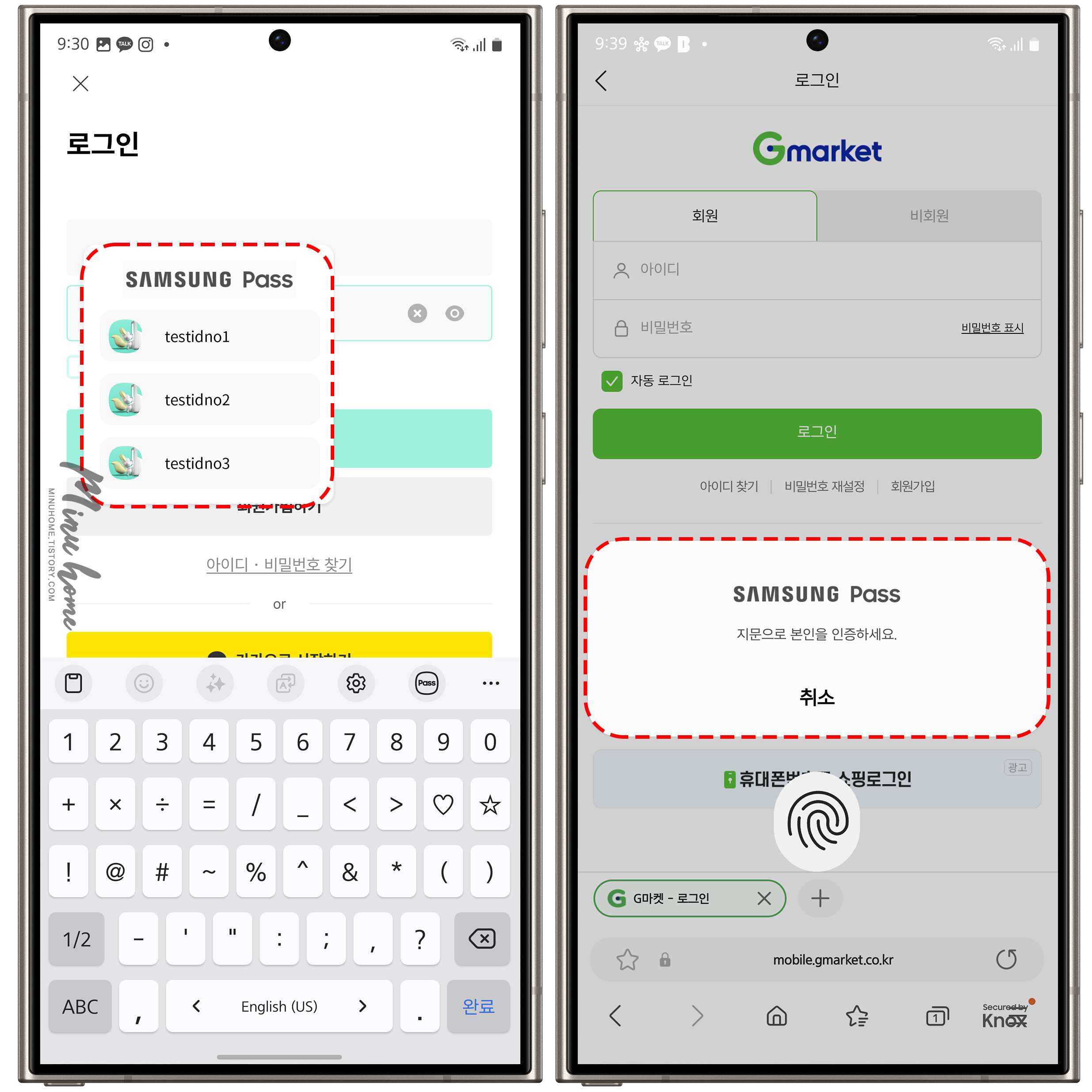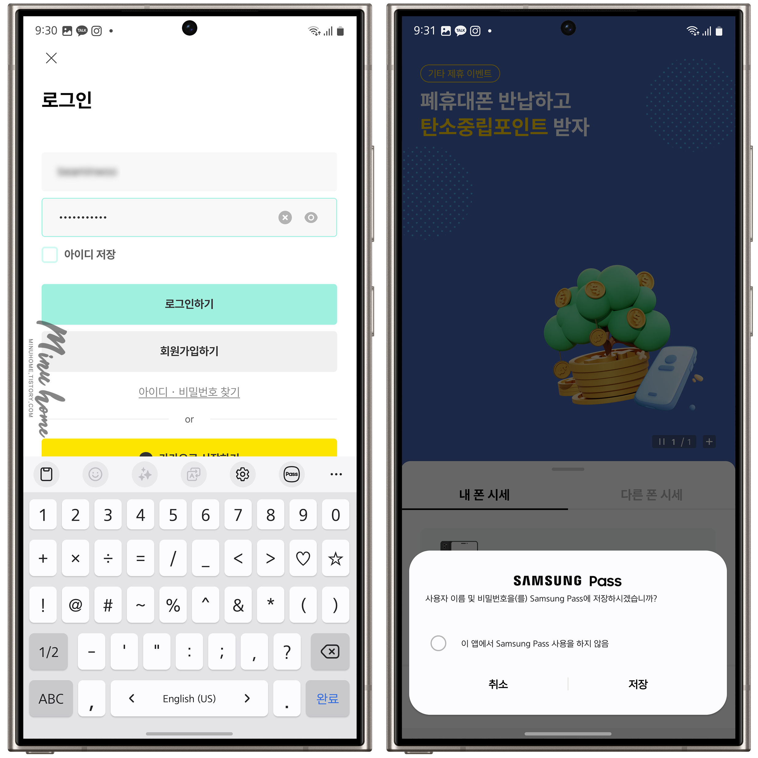 저는 대부분 저장을 하고 삼성패스에 기록을 해두고 있습니다, 삼성패스를 등록하면 위 이미지처럼 로그인 정보를 생체인식을 통해 쉽게 로그인할 수 있습니다.