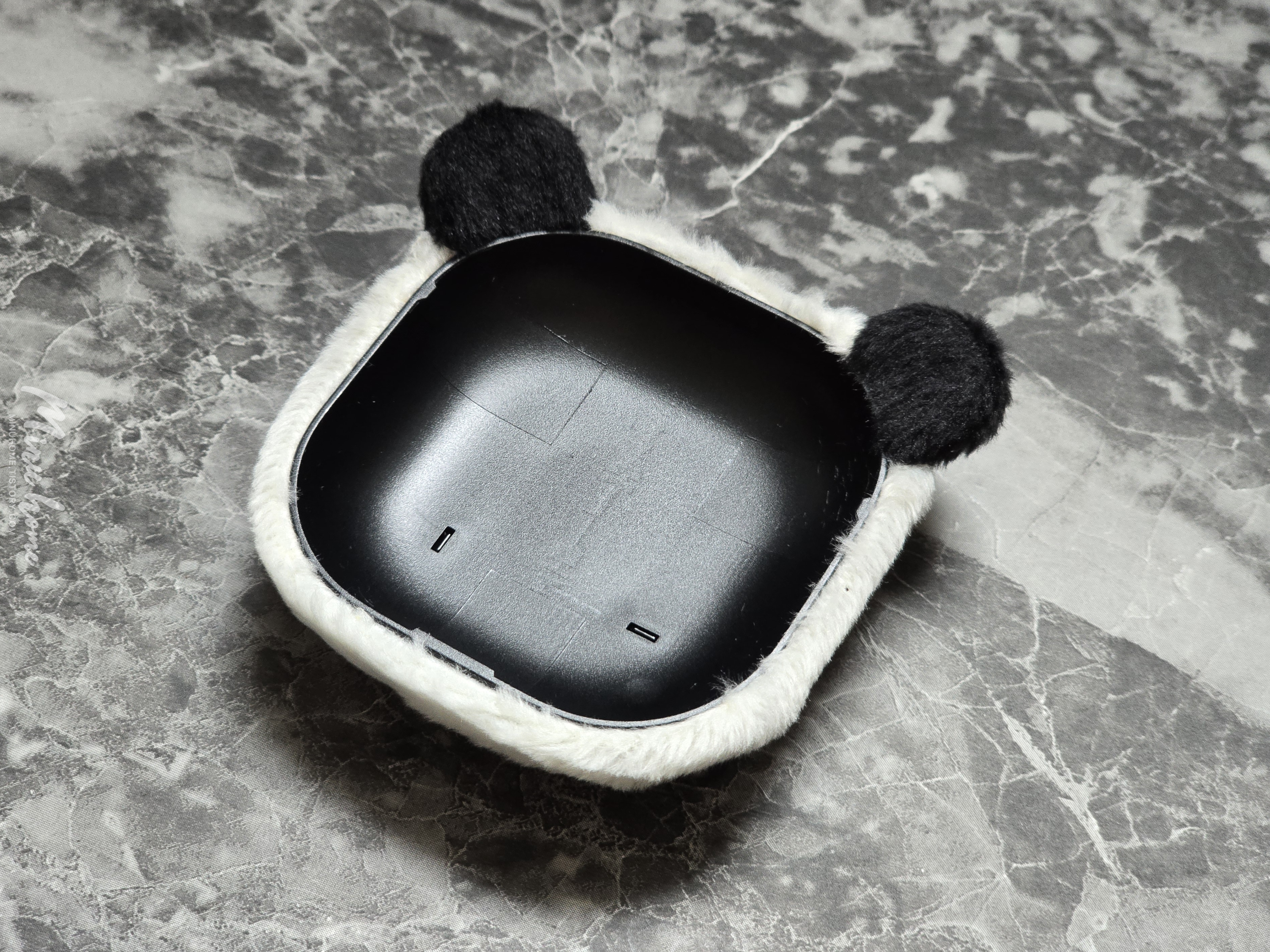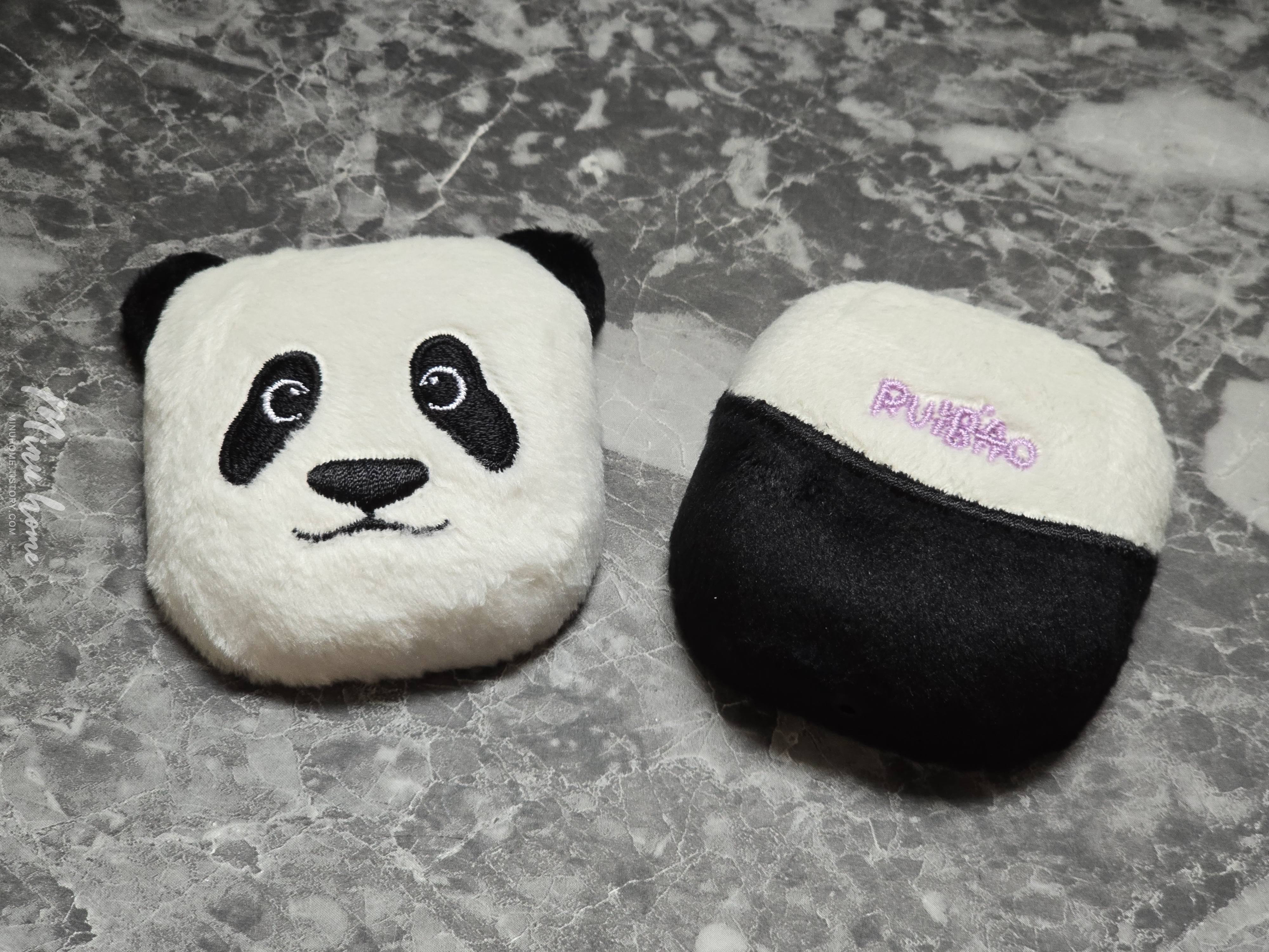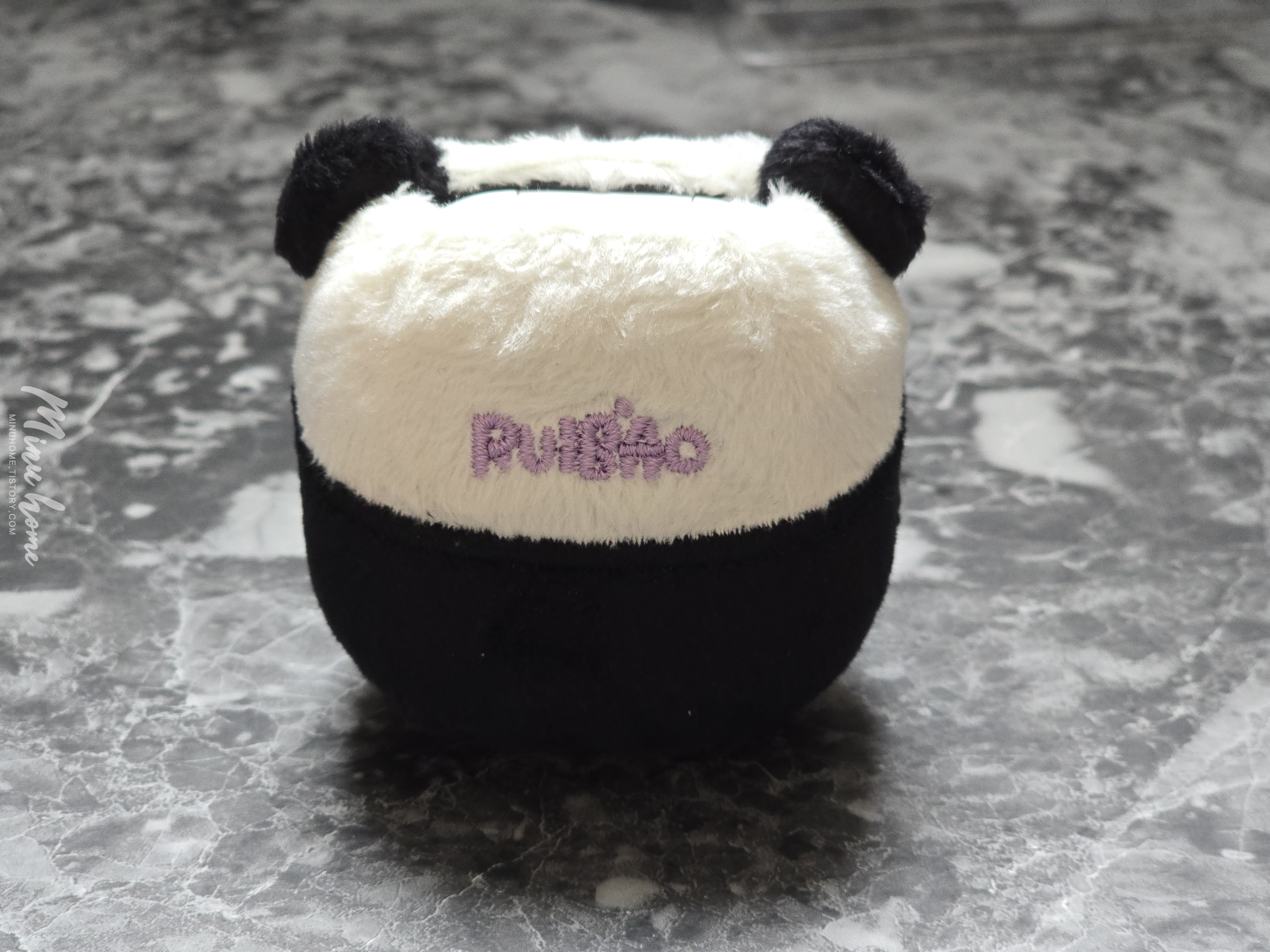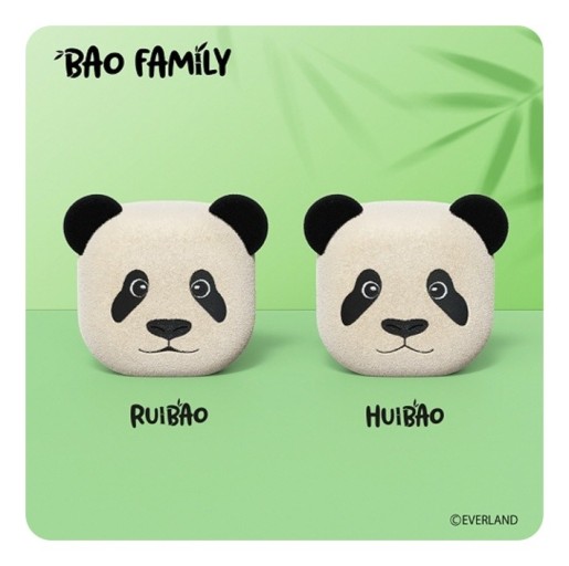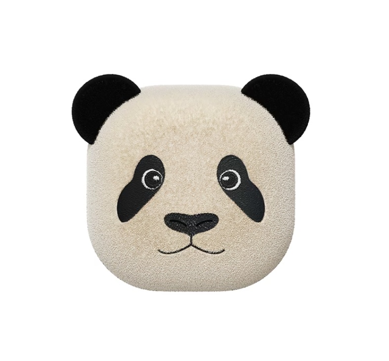 박스를 오픈해 보면 귀여운 케이스가 위아래로 들어있습니다. 재질이 보들보들 한 느낌이 들어 푹신한 느낌을 받을 수 있습니다. 전면에는 루이바오의 얼굴을 형상화 한 얼굴 모양과 후면에는 앉아있는 판다의 뒷모습과 비슷한 디자인으로 제작된 것을 볼 수 있습니다.