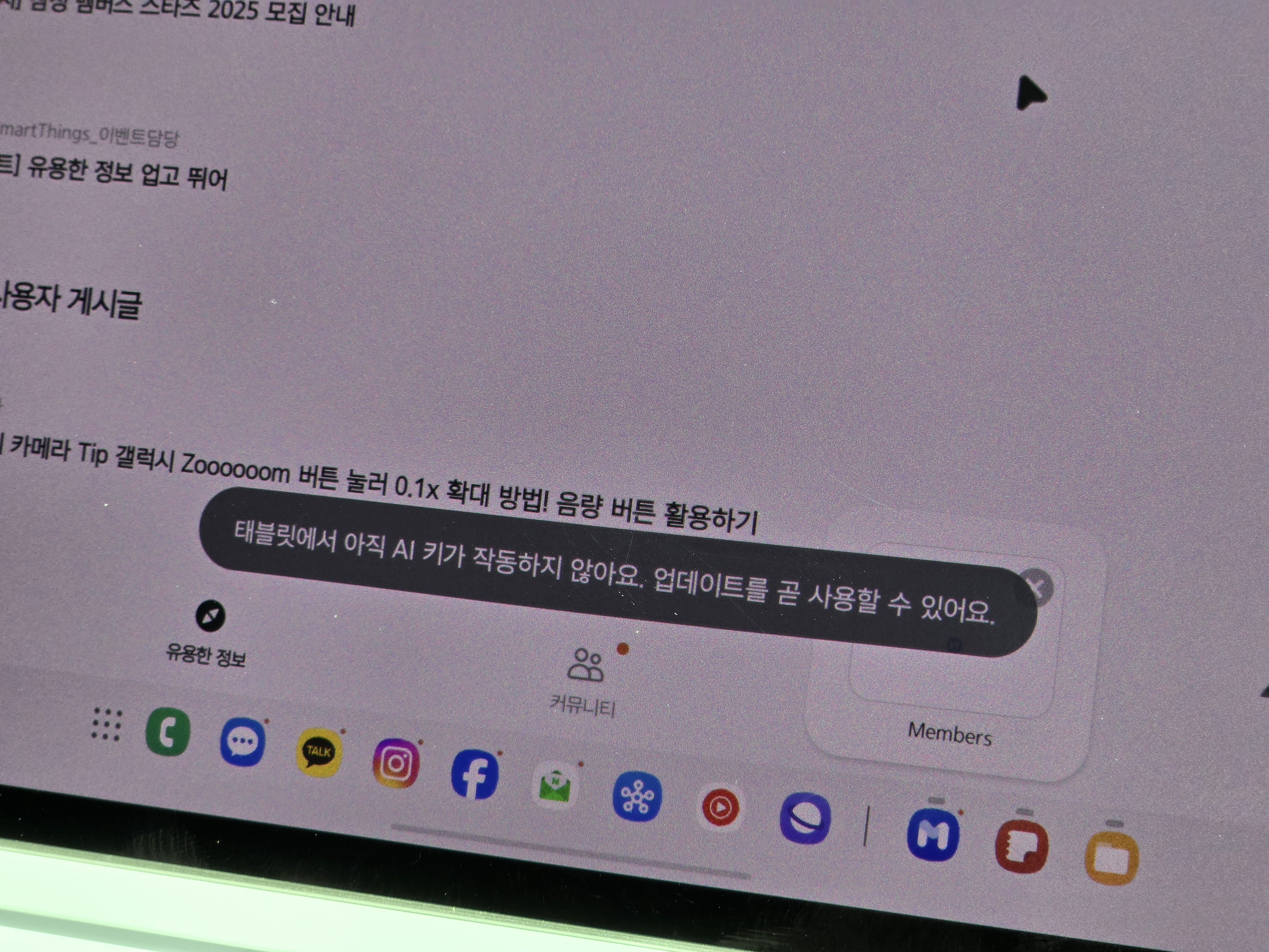 현재 탭 S10 이하 하위 시리즈에서는 해당 버튼을 눌러도 "태블릿에서 아직 AI 키가 작동하지 않아요. 업데이트를 곧 사용할 수 있어요" 라는 멘트와 함께 사용을 할 수 없습니다.