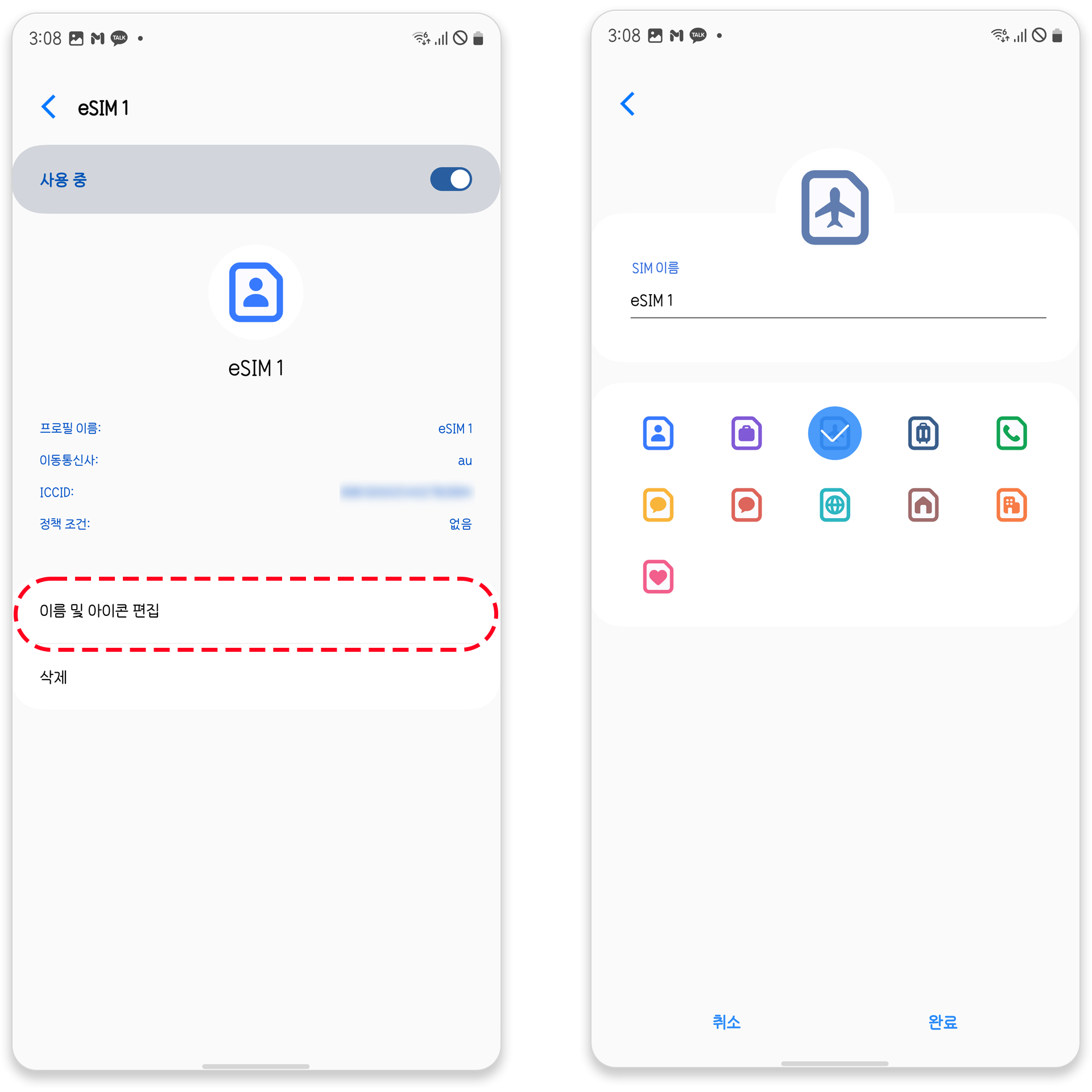 eSIM을 여러 개 등록할 때 헷갈리는 경우가 있기 때문에 eSIM 정보에서 이름 및 아이콘 편집에서 eSIM의 이름과 아이콘을 변경할 수 있습니다.