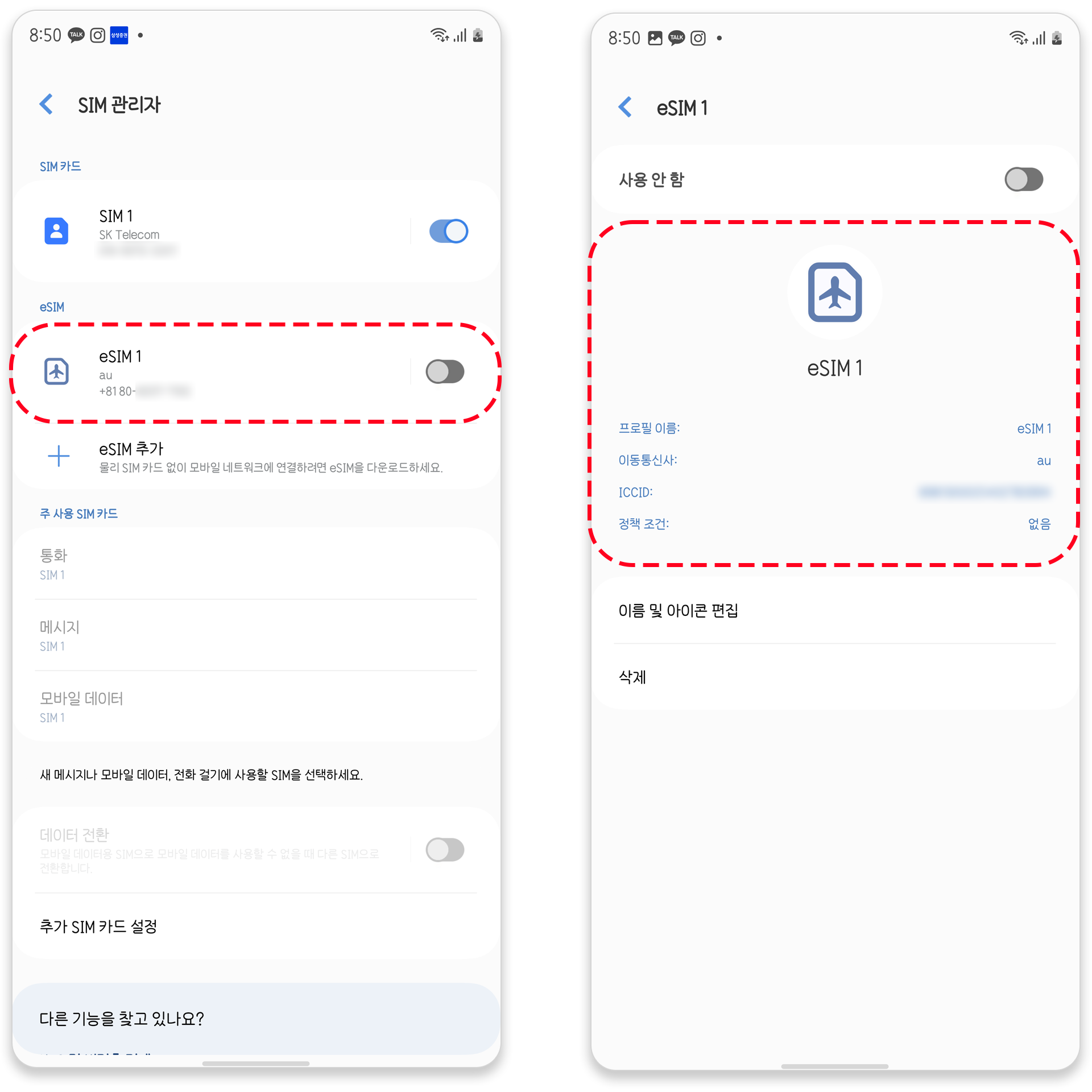 * 단 등록한 eSIM을 삭제한 경우 복원이 불가능하며 새로운 eSIM을 구매해야 하니 삭제하기는 절대 선택 금지!