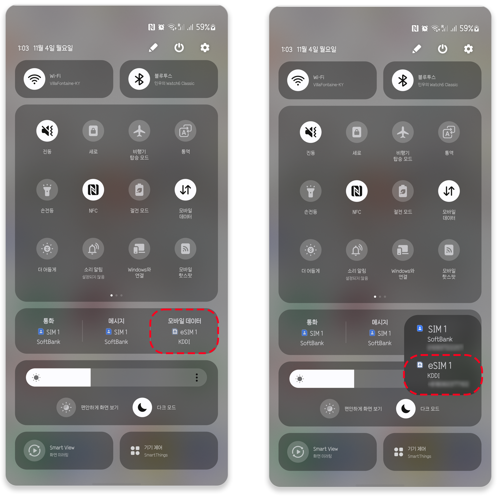 상단 퀵패널을 내리시면 유심정보가 나타나는 것을 볼 수 있습니다. 여기서 모바일 데이터가 현지심으로 된 경우 현지의 국가 정보를 불러오기 때문에 해당 국가로 접속이 가능합니다.