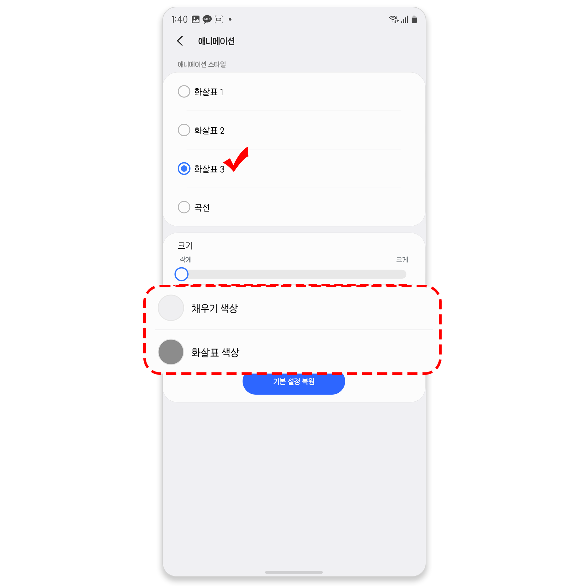 현재 기본적으로 적용 된 제스처와 비슷한 애니메이션은 화살표 3 이며, 여기서 채우기 색상과 화살표 색상을 커스텀할 수 있습니다.