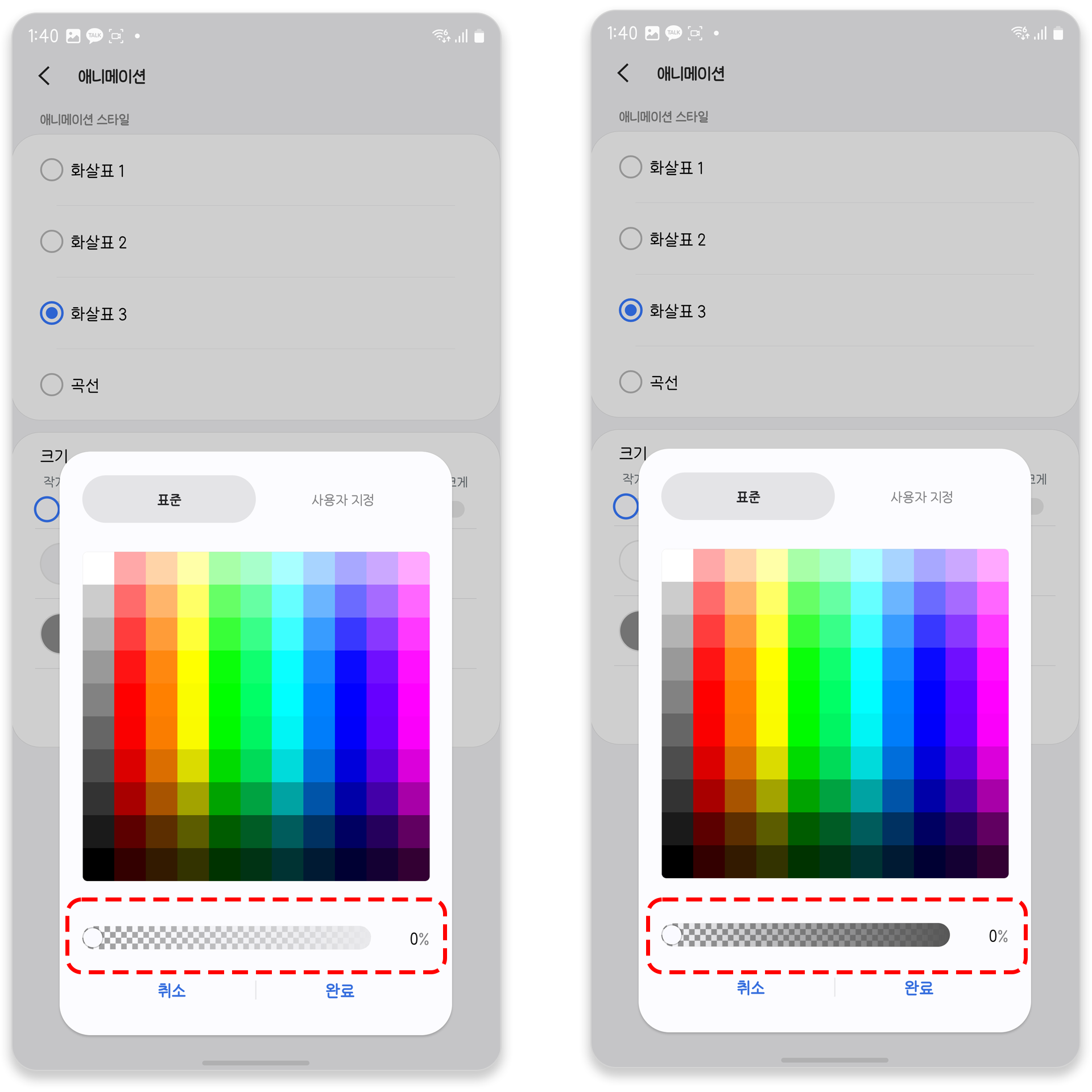 각각의 옵션을 선택하면 제스처 색상과 함께 투명도를 조절할 수 있는데 여기서 투명도를 채우기, 화살표 모두 0%로 설정해주세요.