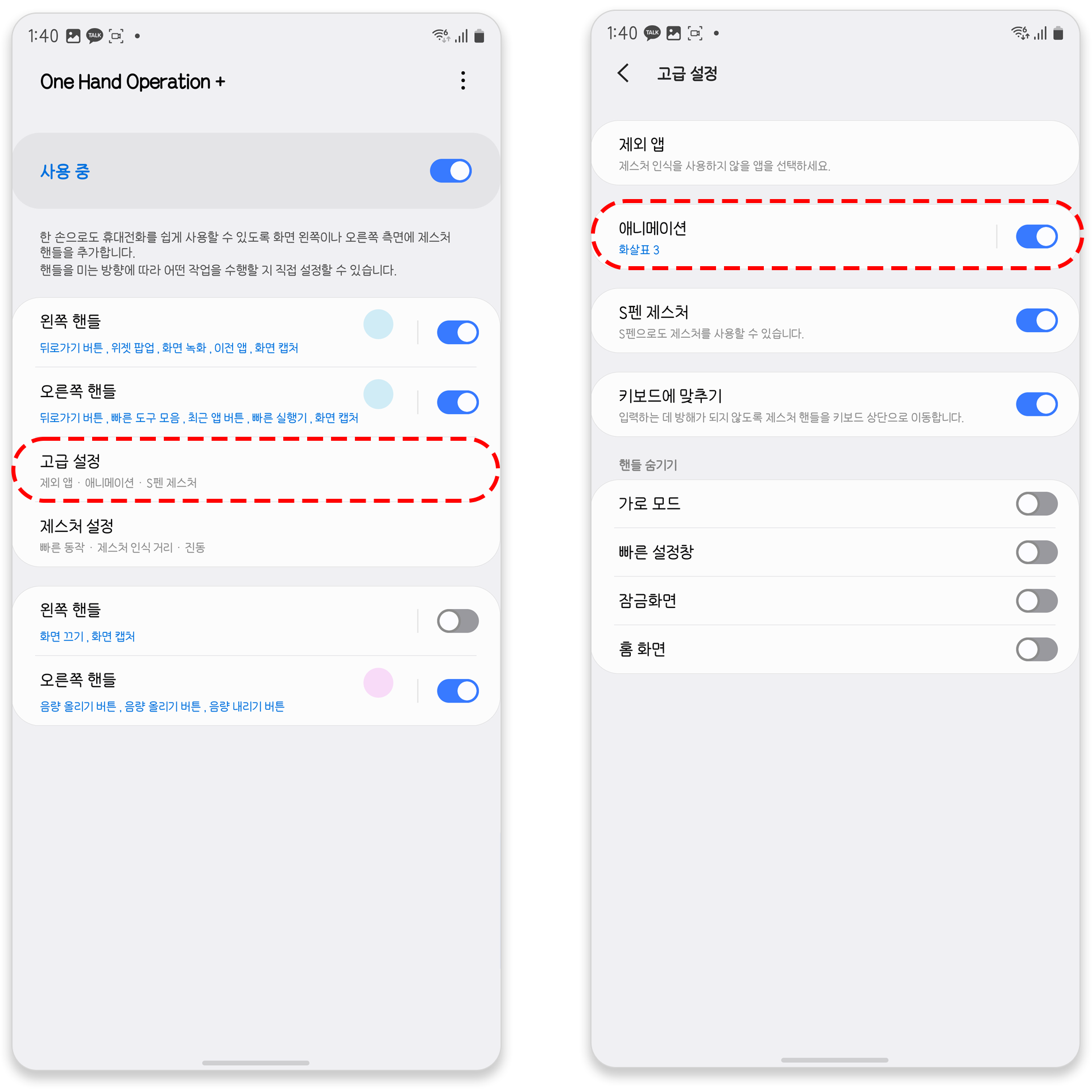 원 핸드 오퍼레이션 앱 실행 후 고급 설정 메뉴로 이동합니다. 이동 후 애니메이션 영역을 선택해 애니메이션 설정 메뉴로 이동해주세요.