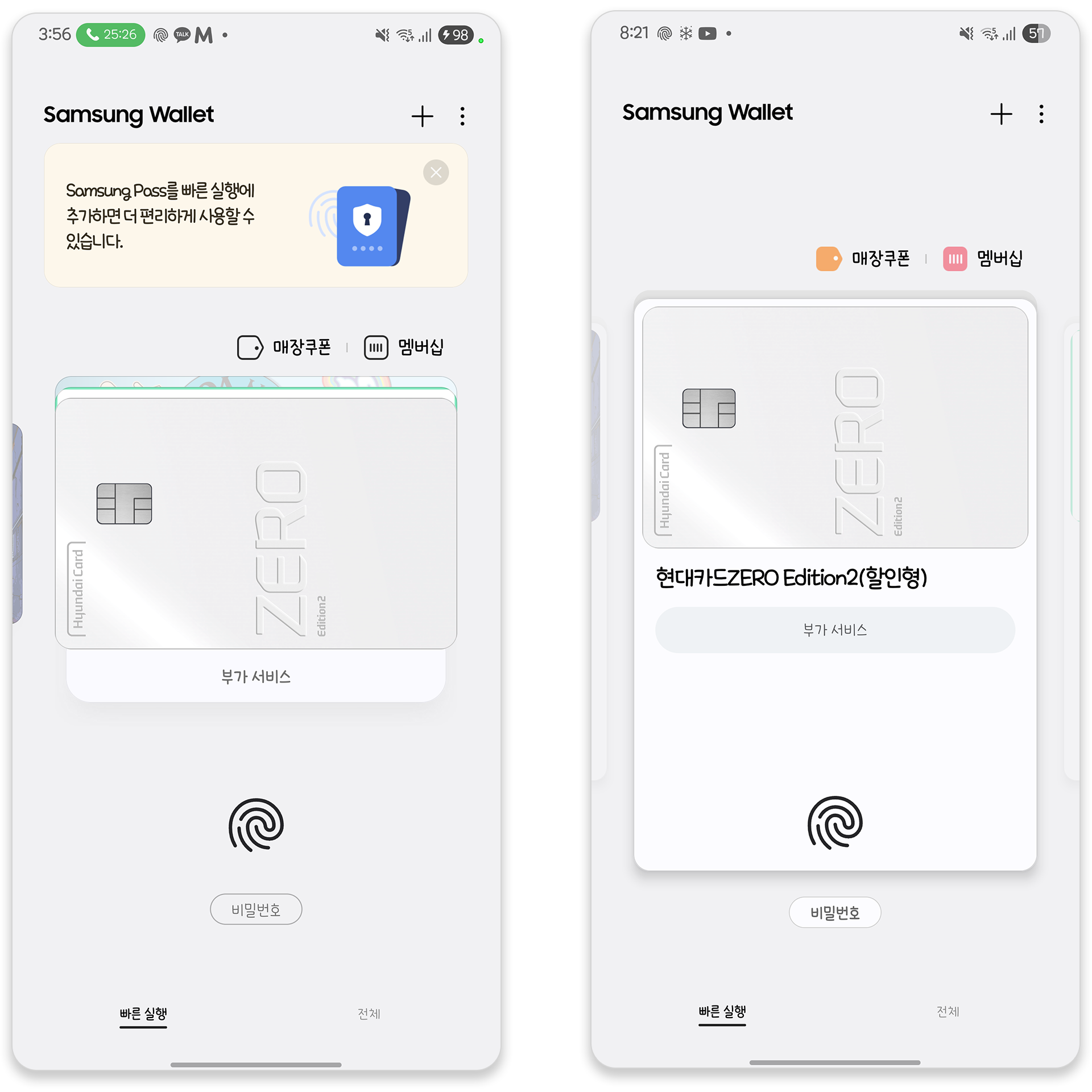 개인적으로는 예전 방식의 스택 형태가 조금 더 직관적이고 깔끔한 느낌인데 이번 업데이트는 카드 아래쪽에 카드 명칭과 부가서비스를 표기하는 것까진 좋은데 굳이 카드 형태로 다 감싸는 디자인이었어야 하는지 조금 아쉬운 부분입니다.