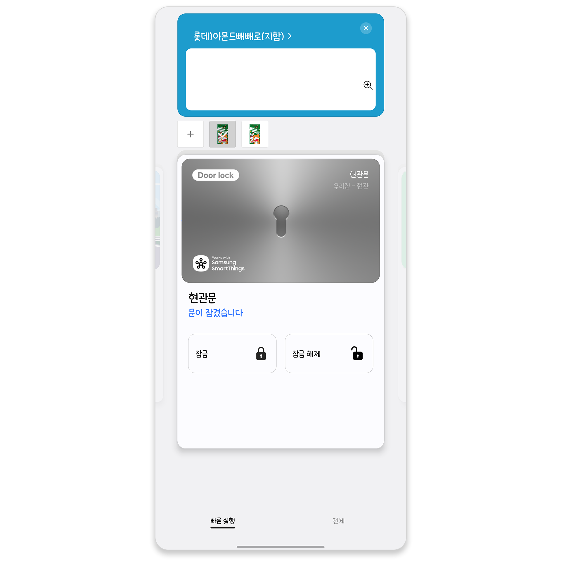카드 항목을 하나씩 넘겨서 볼 수 있고, 위에서 아래 쪽으로 잡아당겨 카드 목록을 불러와 빠르게 실행도 가능합니다.