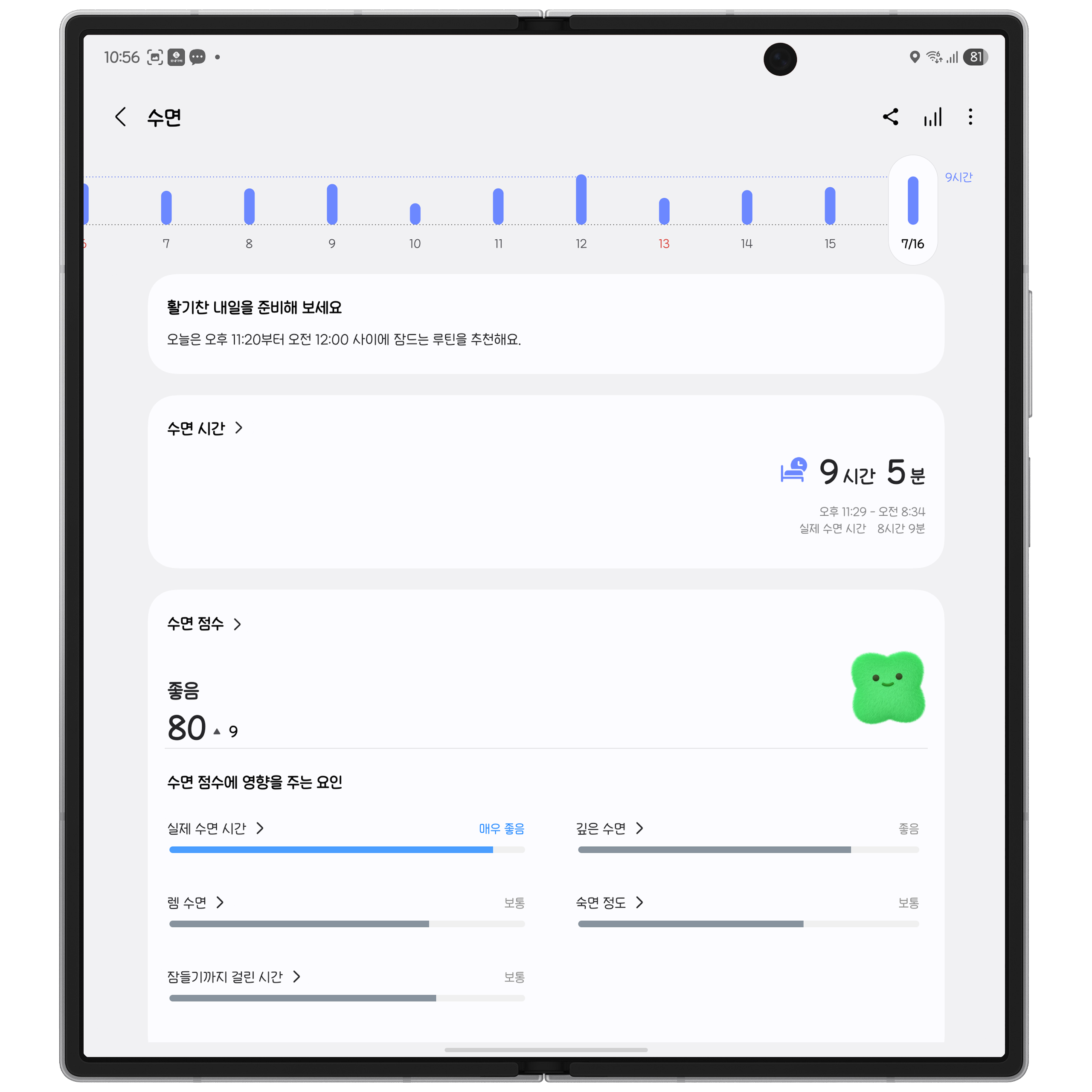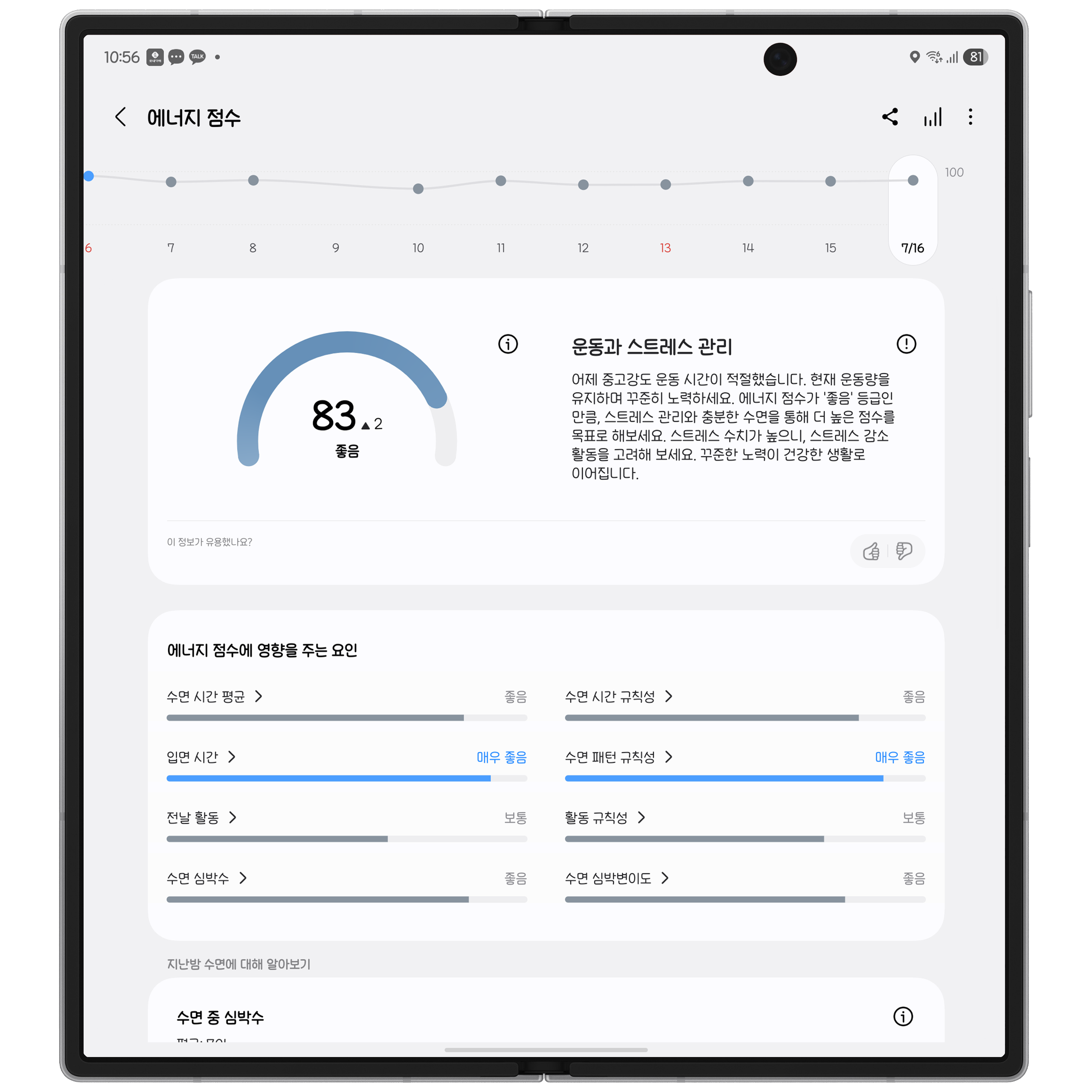 정말 푹 잤다고 느낄 땐 점수가 높았고, 자고 일어나도 어딘가 불편하게 피곤하면 점수가 낮았기 때문에 정확도는 개인적으로 좋았다 봅니다.
