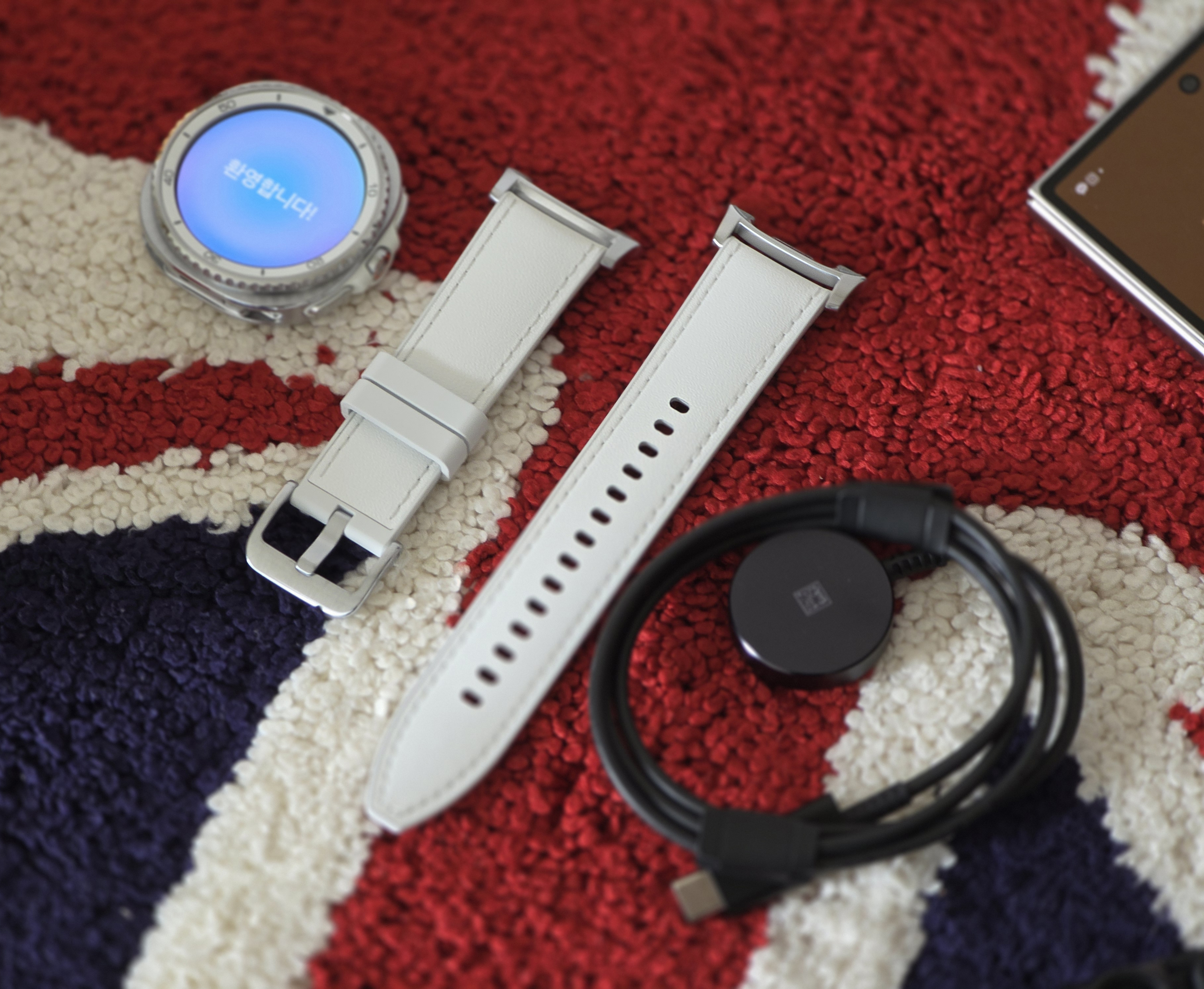 제품의 구성품 박스는 갤럭시 워치 8 클래식 본체 / 기본 동봉 스트랩(생각보다 재질이 좋아요 착용감도 굿!) / 갤럭시 워치 8 충전 케이블 / 사용설명서가 있습니다.