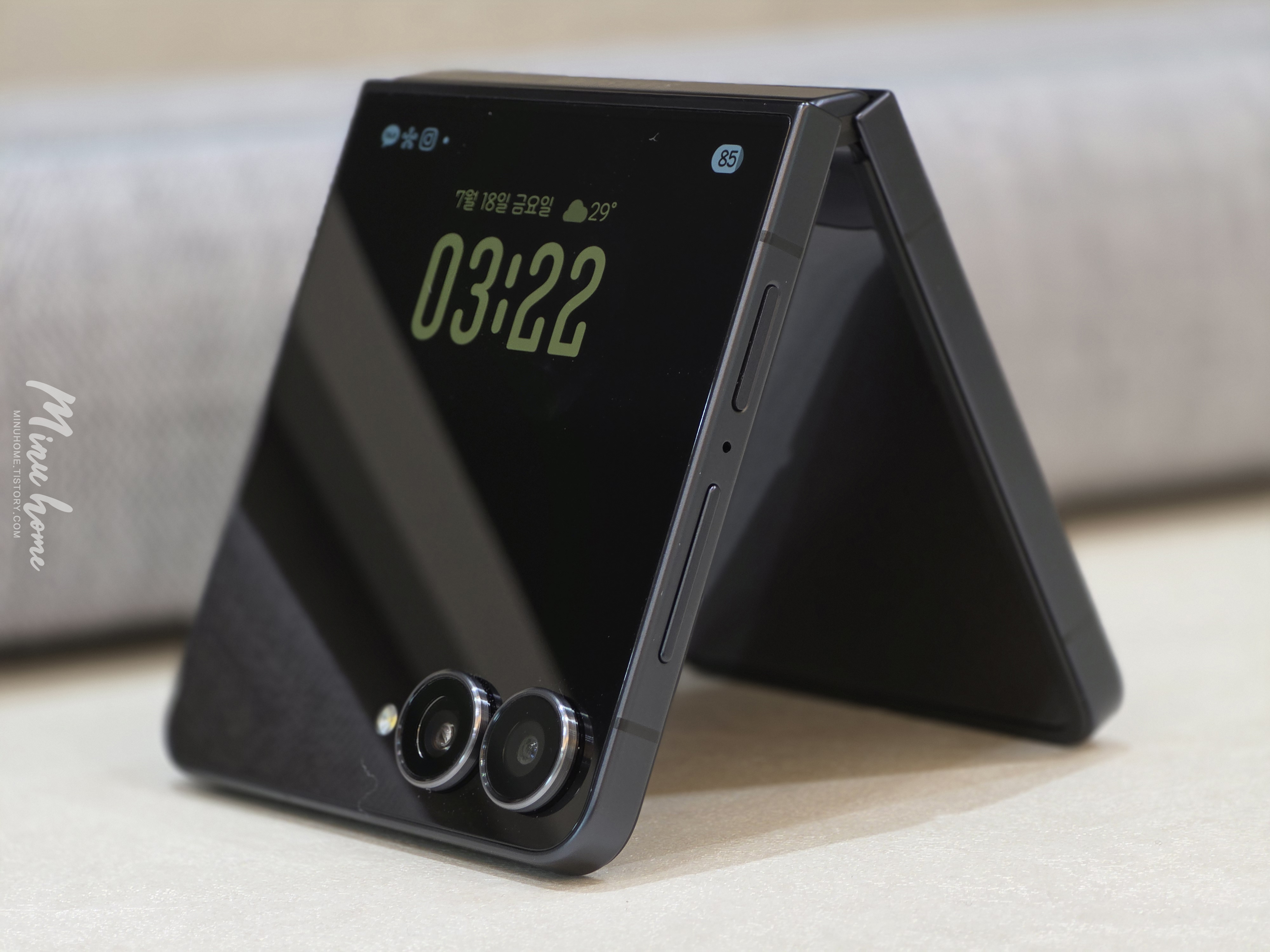 기존 플립6 대비 하단부까지 더 커지면서 풀 스크린을 가지며, 특히 전면 플렉스 윈도우의 화면이 더 크게 보이는게 베젤이 확실히 많이 줄었습니다.