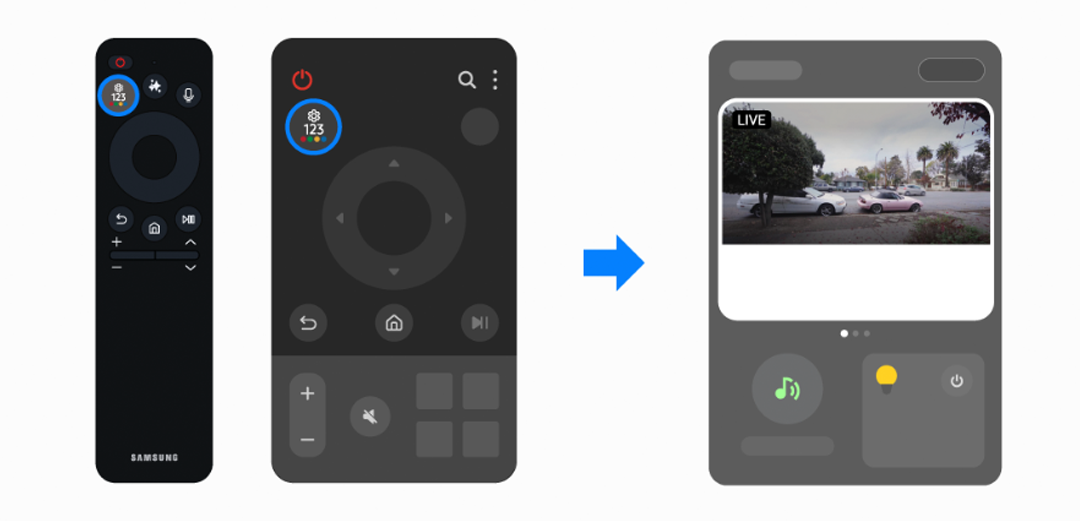 - TV를 시청하면서 리모컨의 설정키를 눌러 홈 카메라 보기, 내 폰 찾기, 수동루틴, 자주 쓰는 기기 제어 등을 실행할 수 있는 TV