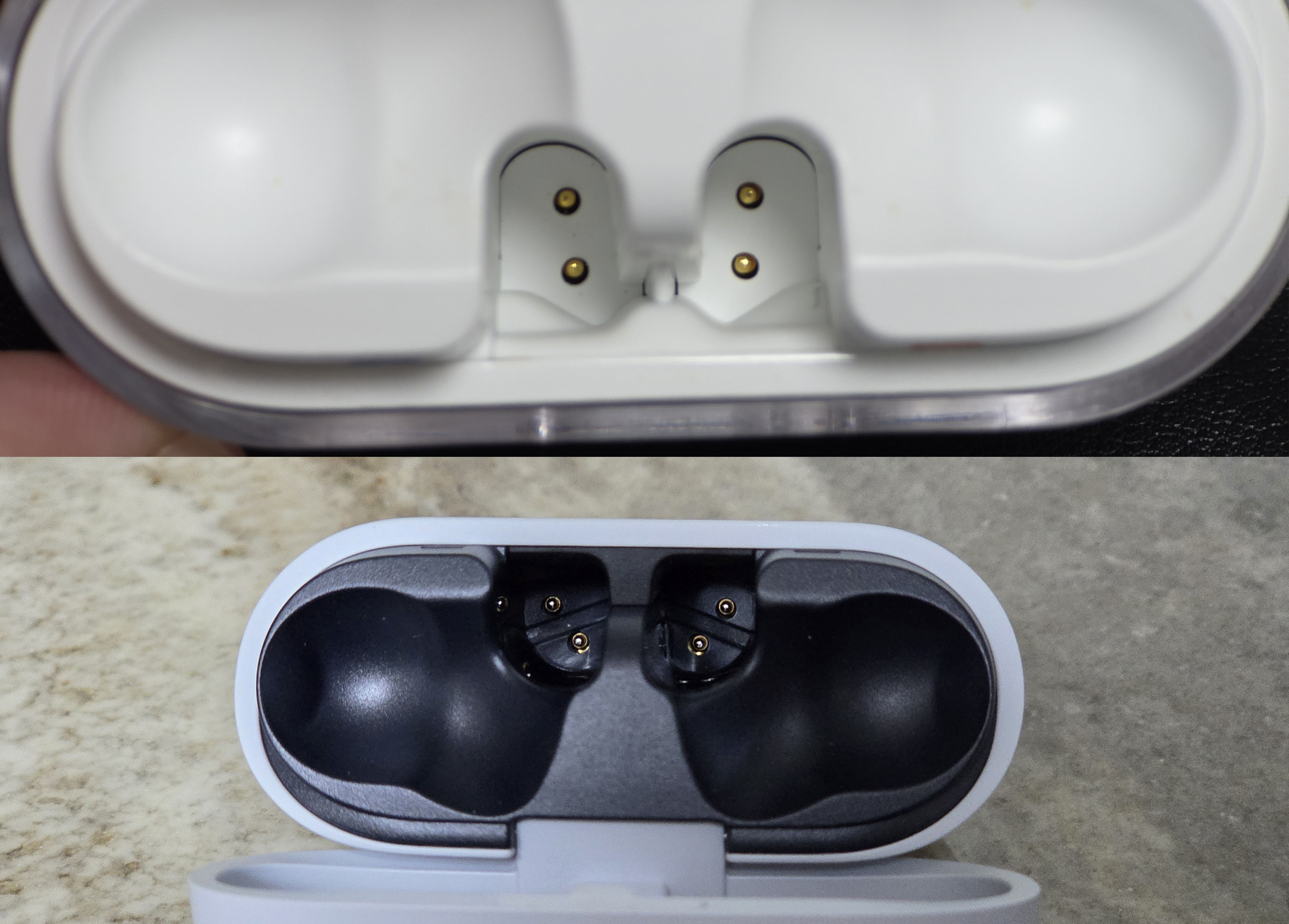 갤럭시 버즈 3 프로와 갤럭시 버즈3 FE의 충전 핀 단자를 비교해보면 기존에는 충전핀이 이어버드에 닿으면 충전이 가능한 구조였지만 버즈3 FE에서 충전핀 단자가 대각선형태로 바뀌었고, 충전핀이 노출된 모습을 볼 수 있습니다.