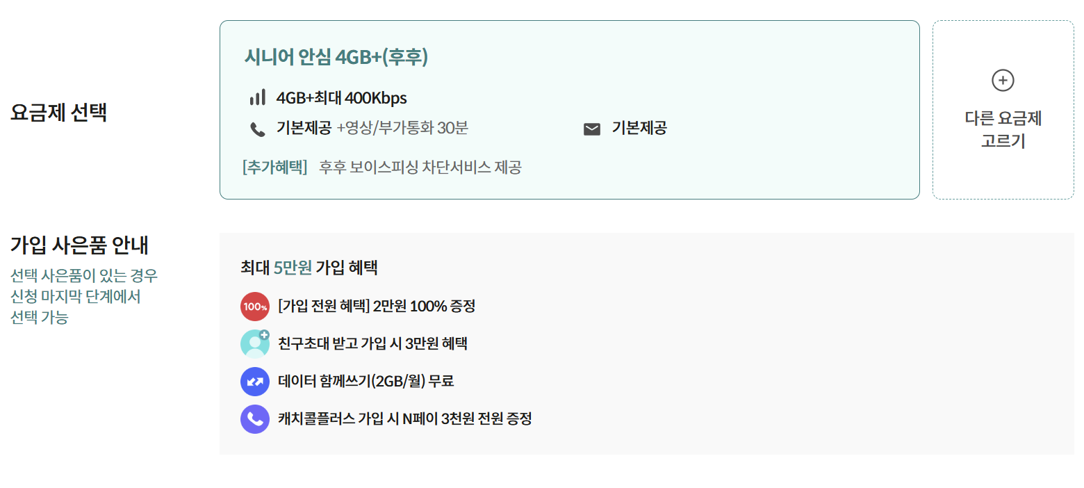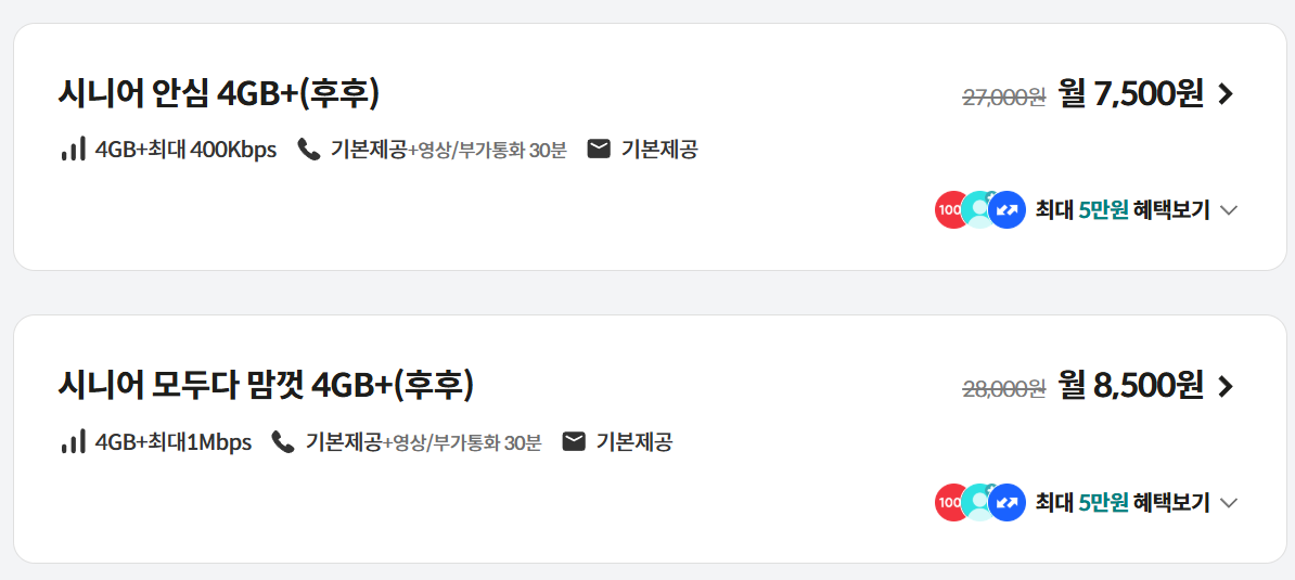 | 시니어 모두다 맘껏 4GB+ | 기본 제공 +영상/부가 통화 30분 |