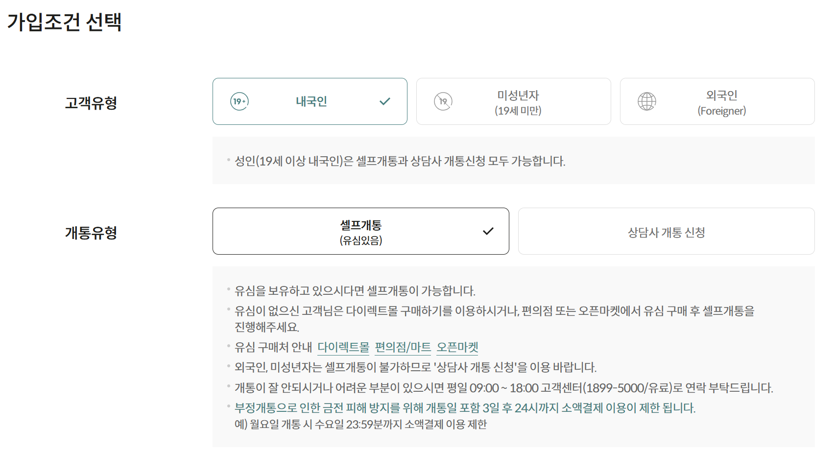 셀프개통 가입 조건은 내국인 / 미성년자 / 외국인의 고객 유형을 선택해 가입할 수 있습니다.