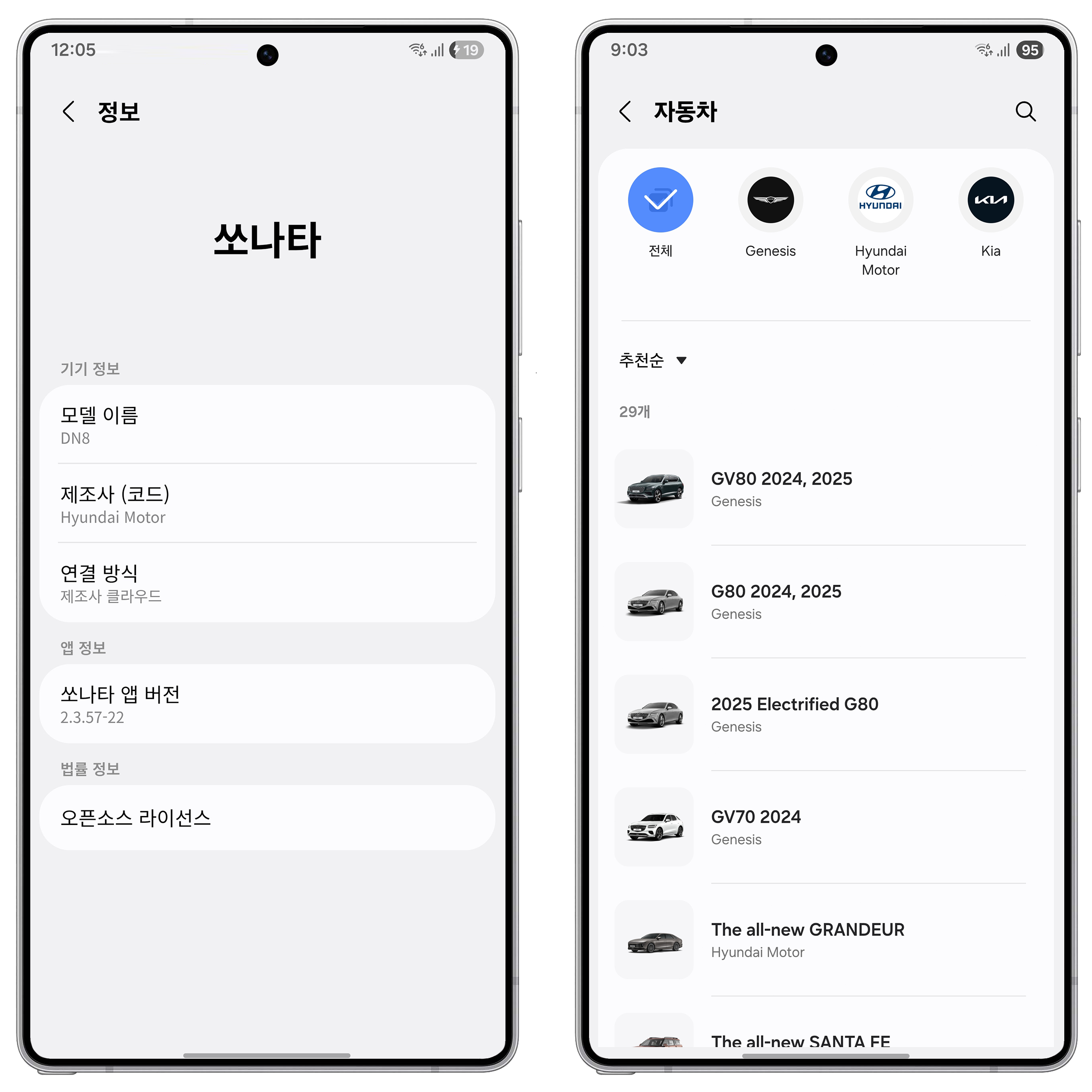 현대 모터스를 선택하면 현대 블루링크 앱과의 연동작업을 위해 로그인을 요구합니다, 로그인을 하면 내가 현대 블루링크에 등록한 차량이 목록으로 나타납니다.