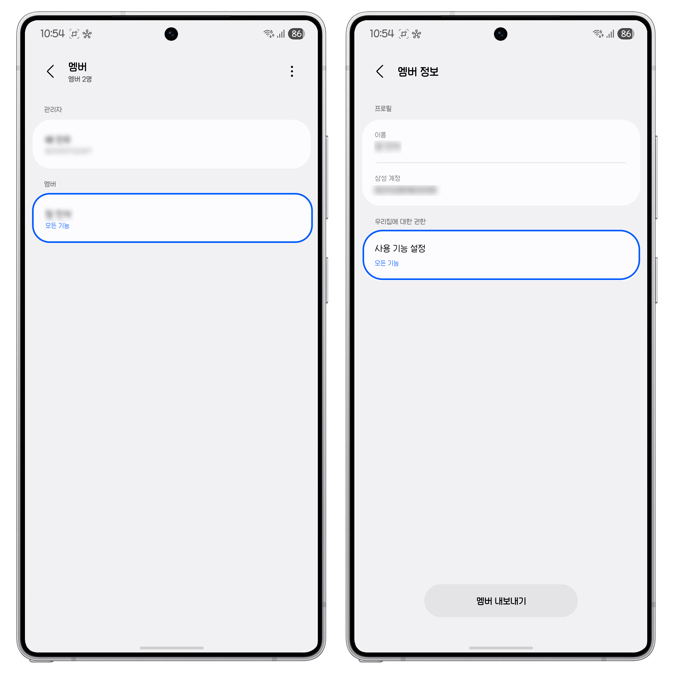 멤버를 선택하면 멤버 정보와 함께 사용 기능 설정에 기기 권한을 설정하거나, 멤버를 내보낼 수 있습니다.