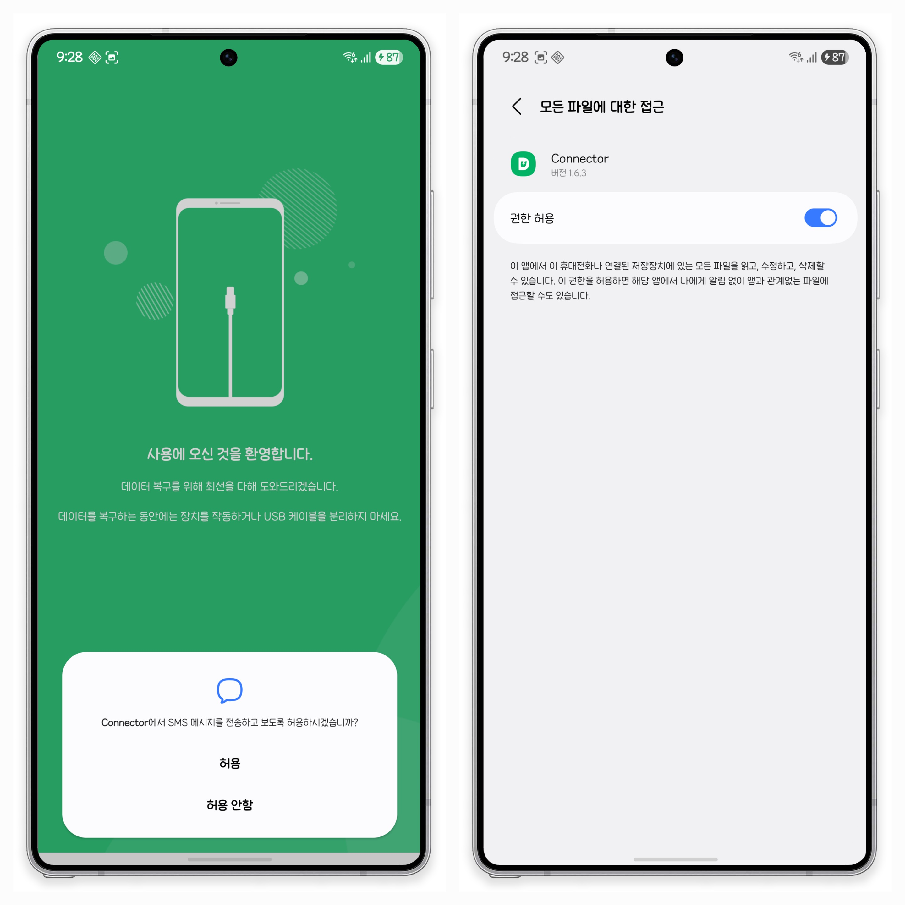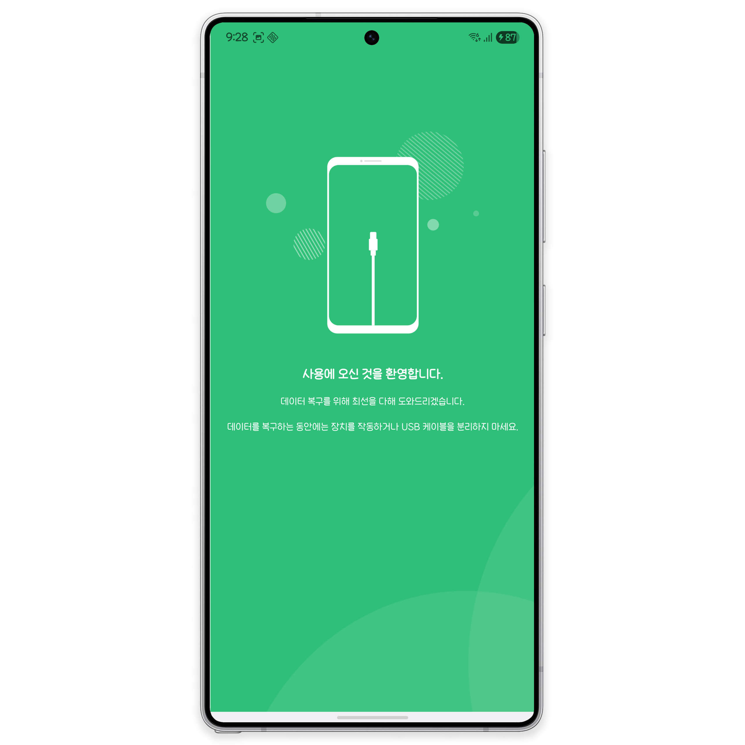 디바이스 내 단말 복구 외 다양한 앱을 통해서도 데이터를 복구할 수 있는데요, 디바이스를 연결해서 안드로이드 데이터 복구를 활용해보겠습니다.