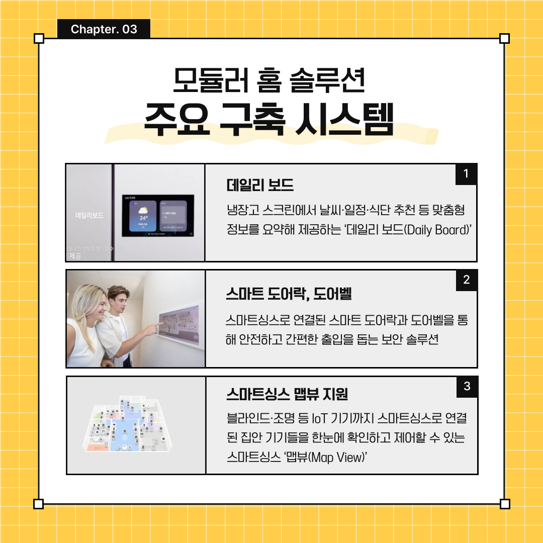 이번에 선보인 삼성의 '모듈러 홈 솔루션'은 스마트싱스를 기반으로 AI 가전, IoT 기기, 에너지 솔루션 등이 연결되어 실내 환경을 최적화하고 에너지 효율성을 높이는 것이 특징입니다.