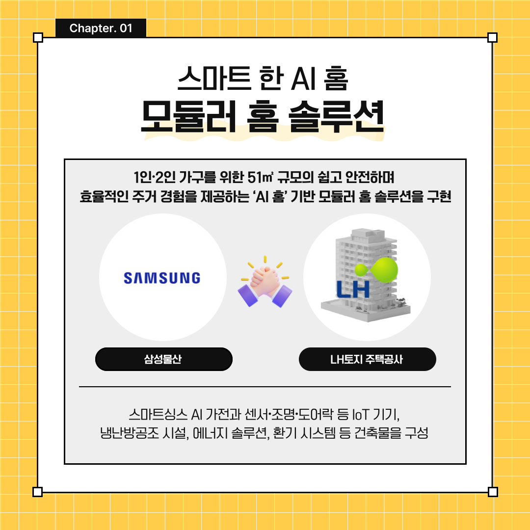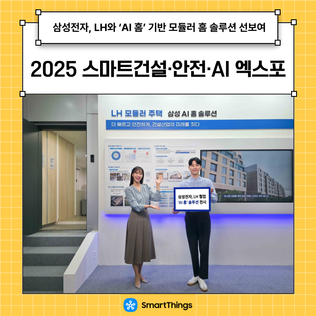 삼성전자는 한국토지주택공사(LH)와 함께 '2025 스마트건설·안전·AI 엑스포'에서 'AI 홈' 기반 모듈러 홈 솔루션을 공동 전시하며 모듈러 홈 솔루션 사업을 국내외로 확장하고 있습니다.