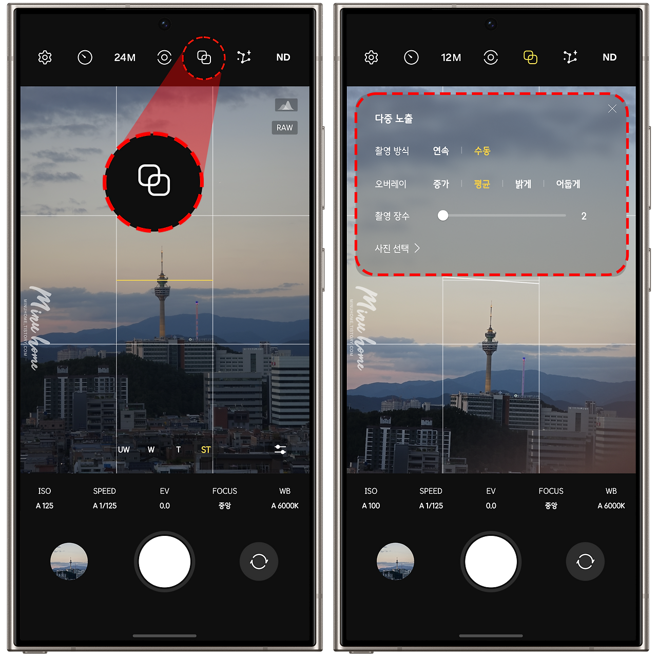 사실 다중 노출의 경우 1차 촬영 후 2차 촬영 표본을 합성하는 형태의 사진인데요,