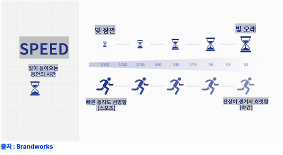 셔터스피드의 경우 빛이 들어오는 시간입니다. 빛이 잠깐 들어오면 빠르게 셔터가 닫히면서 촬영이 가능하기 때문에 움직이는 피사체를 찍을 때 셔터스피드를 낮춰 촬영하면 좋고,