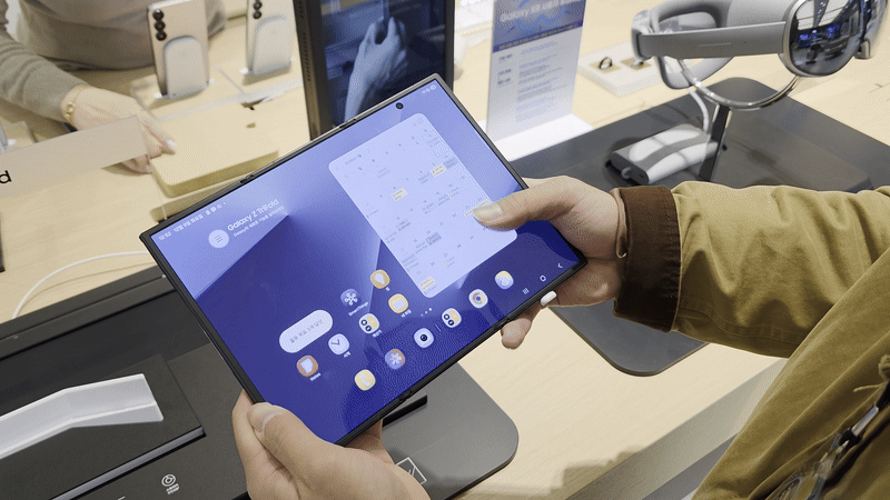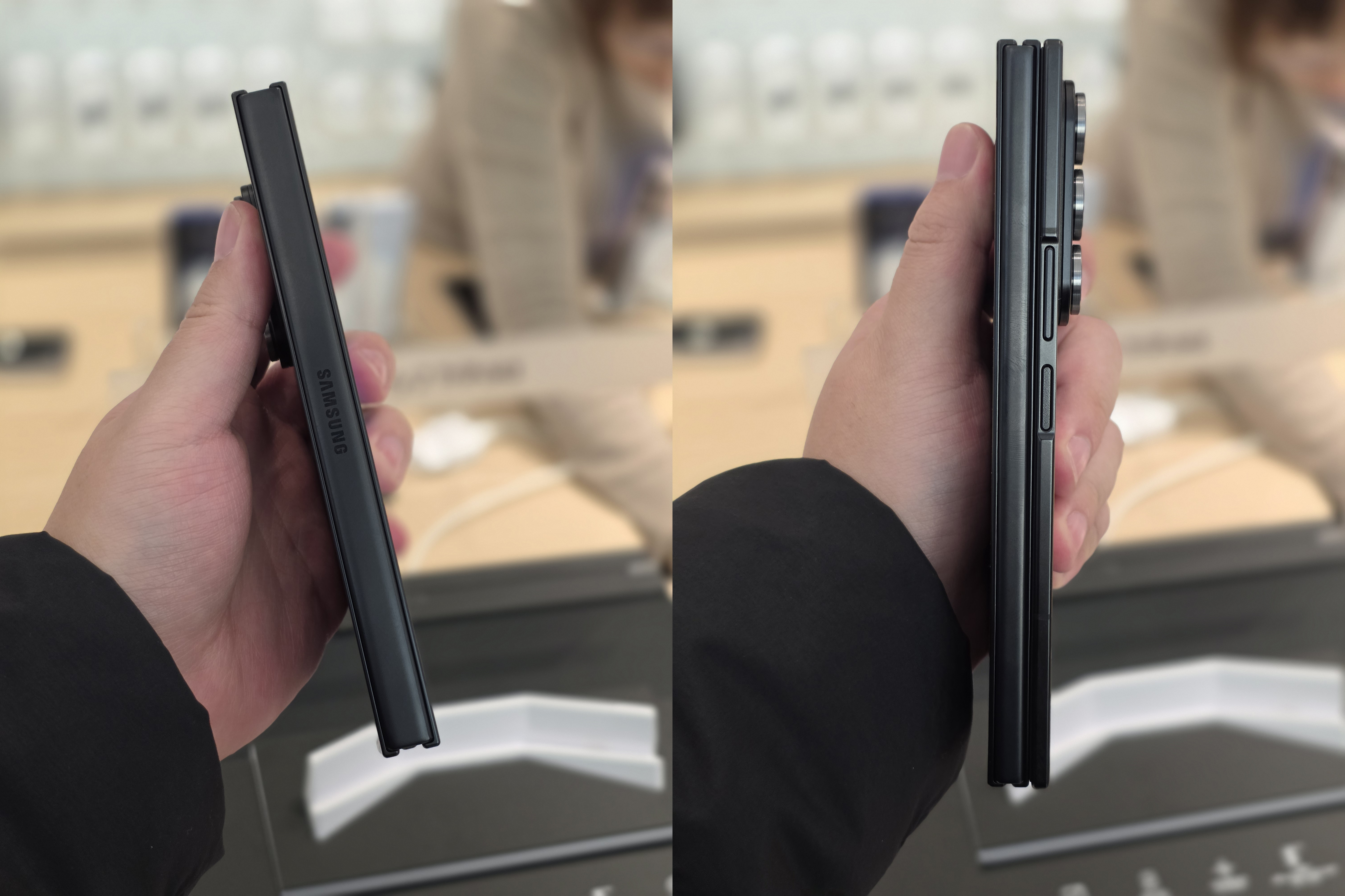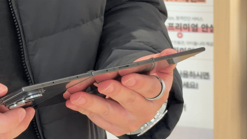 갤럭시 Z 트라이 폴드의 두께는 사진상이나 여러개의 프레임이 겹쳐진 형태로 보여지기 때문에 두께감이 크게 많이 두꺼운 느낌을 받을 수 있습니다.