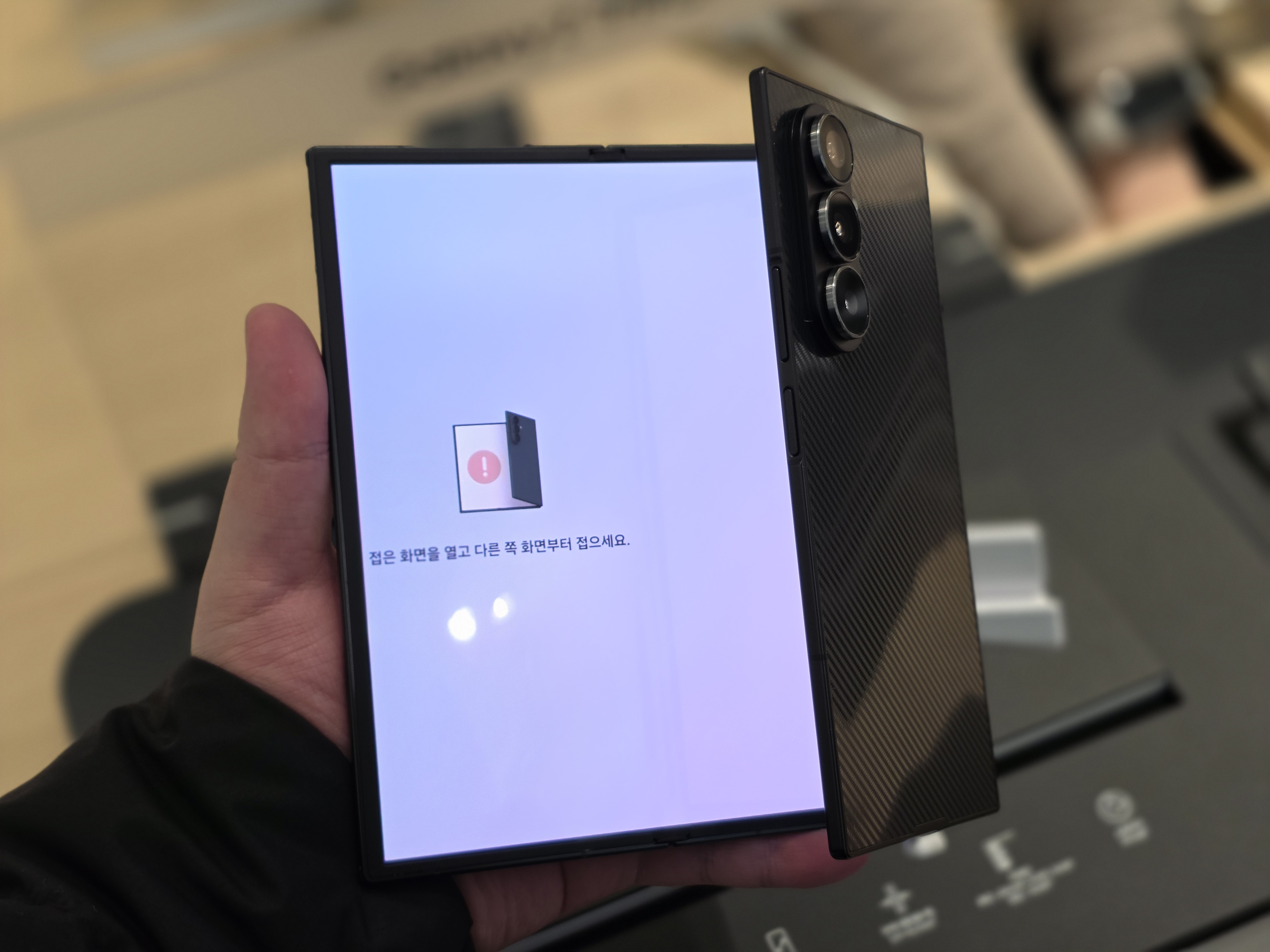 내구성을 위한 인폴딩 구조로 내부를 완전히 펼치지 않았을 땐 블러 처리를 통해 화면을 사용할 수 없도록 제어하고 있습니다.