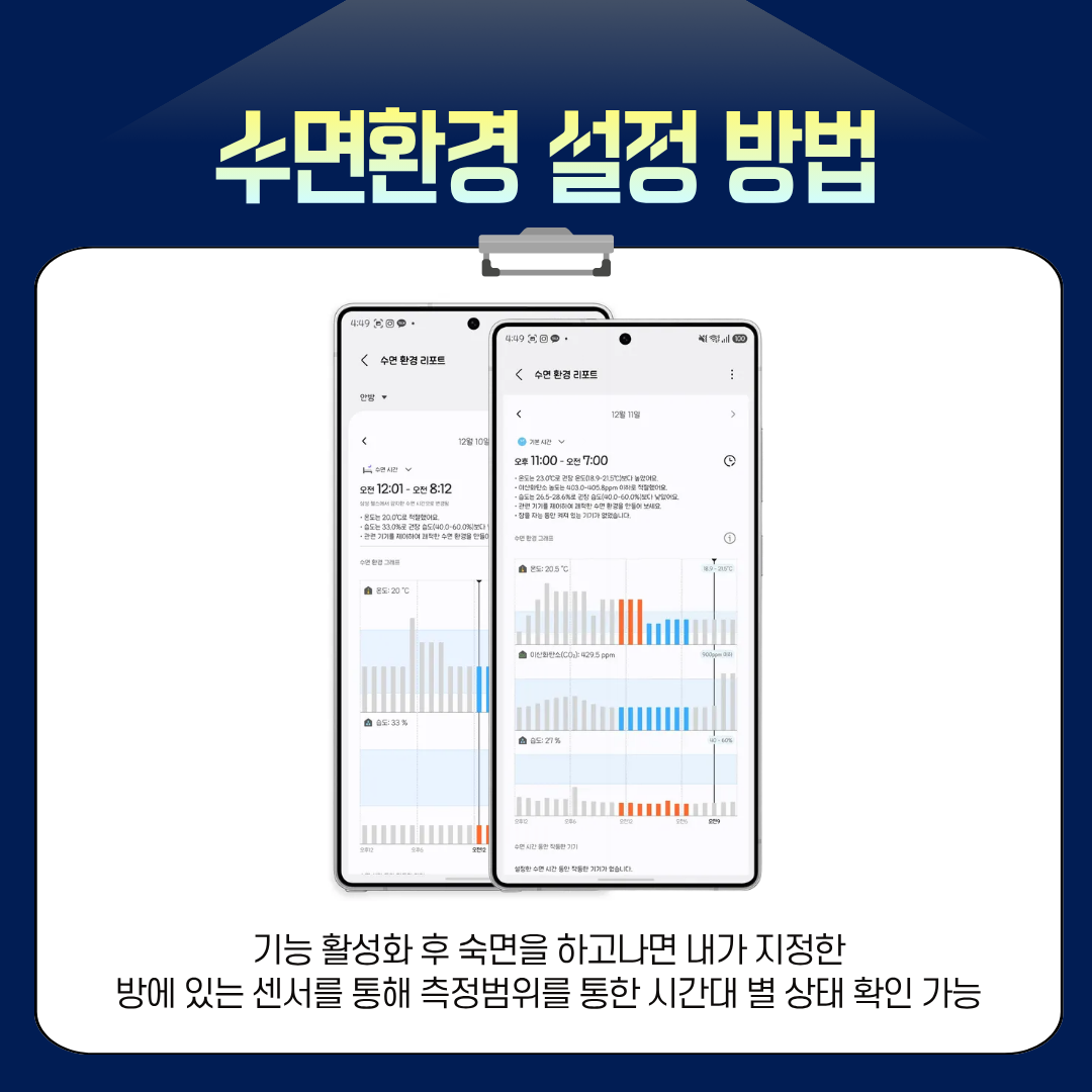 수면 환경 리포트는 방에 등록된 센서를 통해 측정을 하는데 수면환경을 체크하기에는 아무래도 온도센서 / 습도센서 / 공기질 센서를 통해 내가 자는 동안의 수면환경을 체크할 수 있는 기기가 있으면 가장 좋습니다.