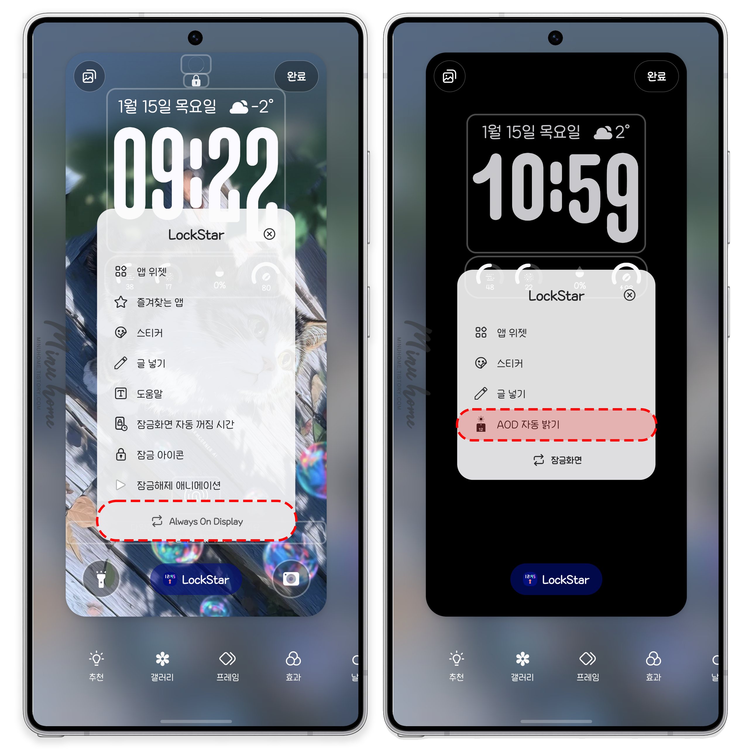 * 글 넣기 기능은 잠금화면과 AOD 상태 따로 설정하여 텍스트를 표기할 수 있습니다.