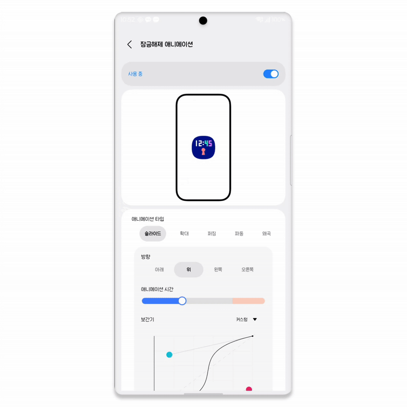 잠금해제 애니메이션은 총 11가지의 화면전환 스타일을 제공합니다,