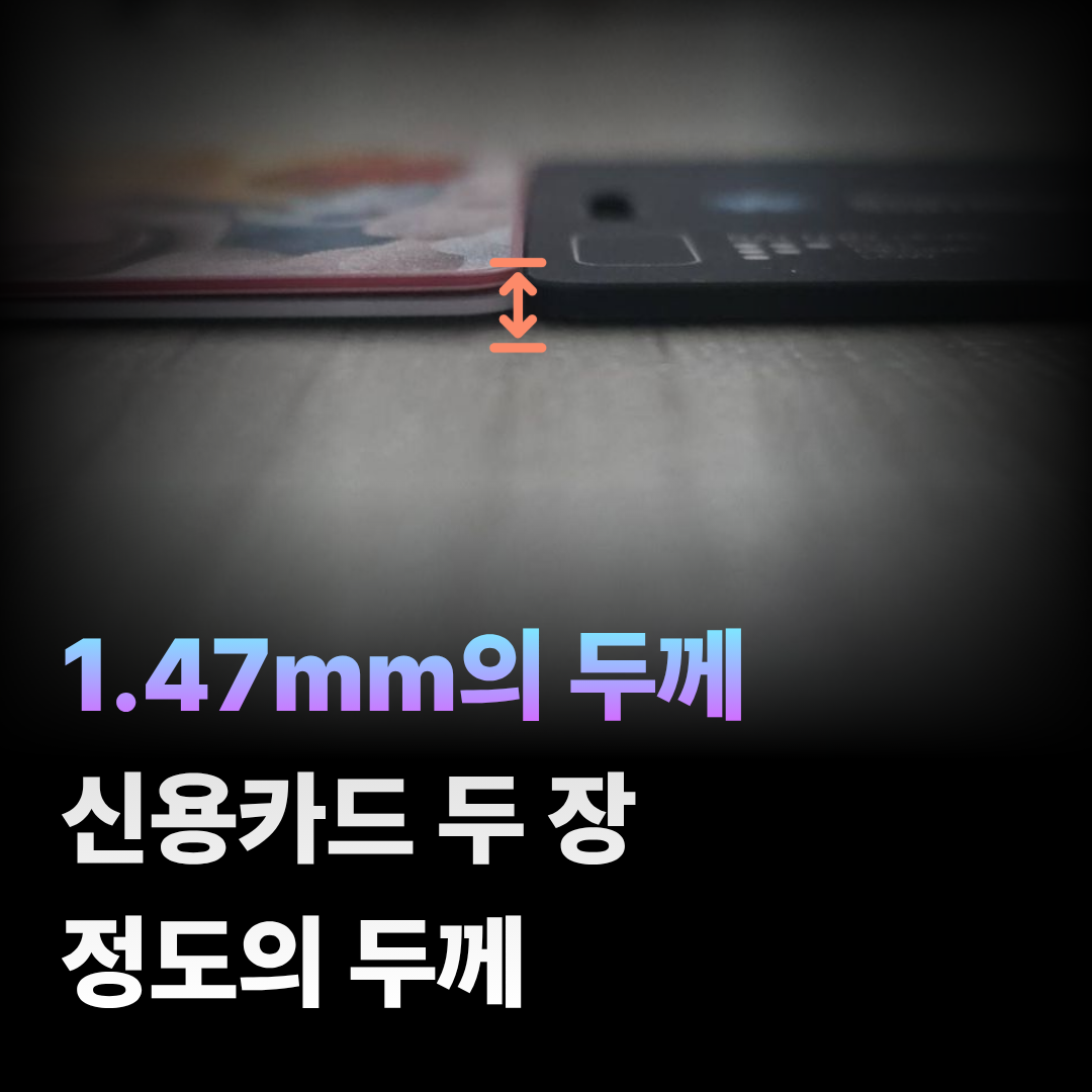 제품의 두께는 1.47mm의 두께를 가지고 있으며 신용카드 두 장 정도의 두께와 비슷합니다.