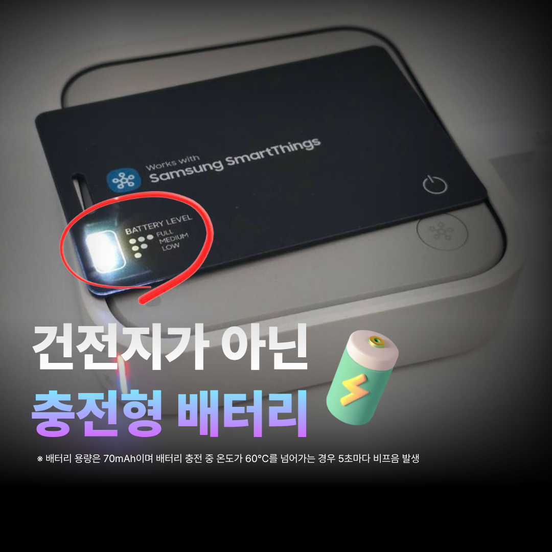 카드형 스마트태그가 좋은 이유는 바로 충전식 배터리가 내장된 형태입니다, 건전지의 경우 교체주기가 다가오면 건전지를 별도로 구매를 해야 하는 번거로움이 있지만 카드형태는 배터리가 내장된 상태이기 때문에 필요시 충전을 통해 간편하게 완충해서 사용이 가능합니다.