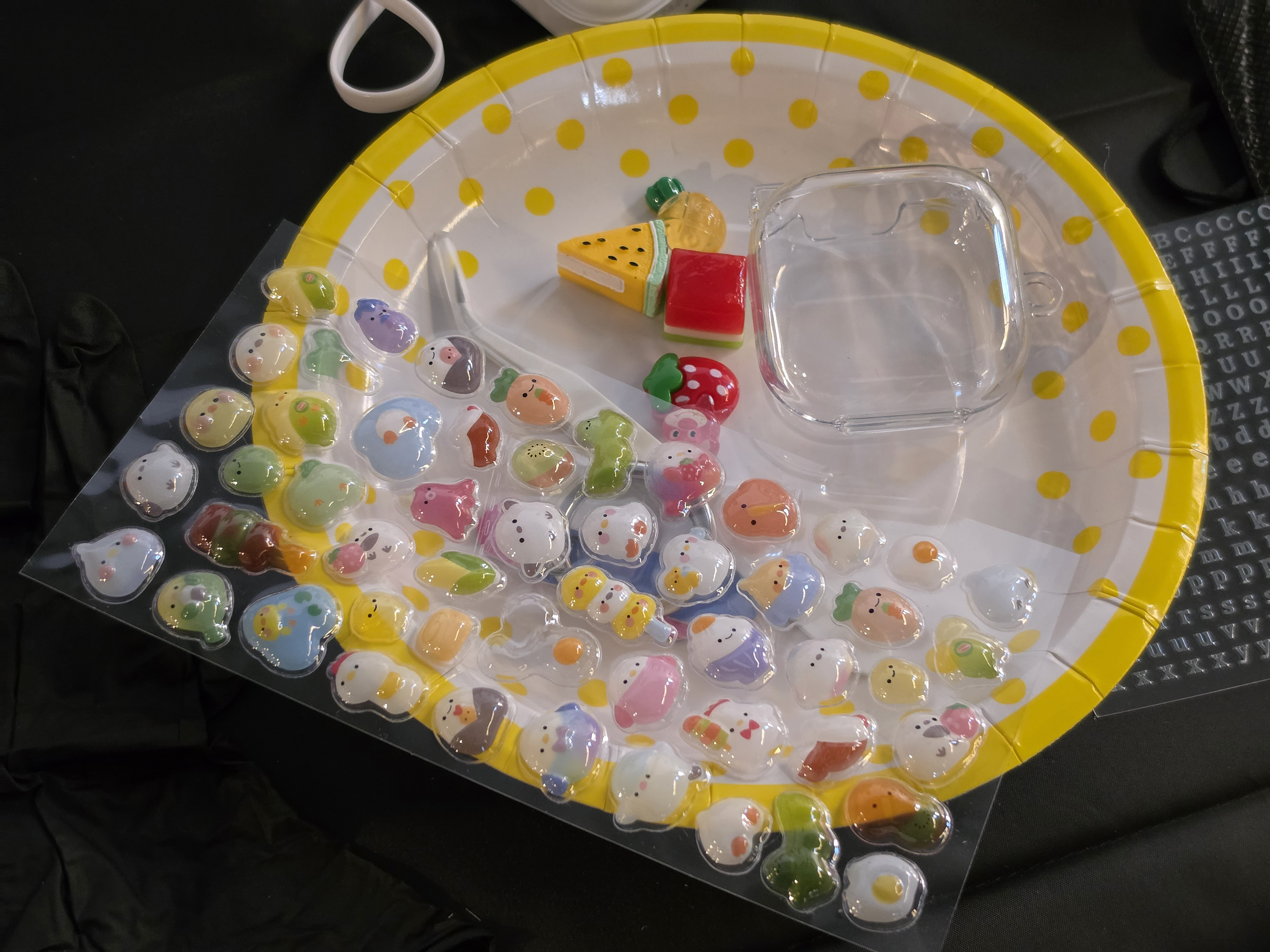 저는 이렇게 꾸며봤습니다~ 저는 레진을 사용하면 망칠꺼 같아서! 레진을 이용하지는 않고 봉봉스티커와 주변에 있는 스티커를 조합해 짬뽕 버꾸를 완성 했습니다~ 대부분 토끼와 별이 많은거 같습니다 !!
