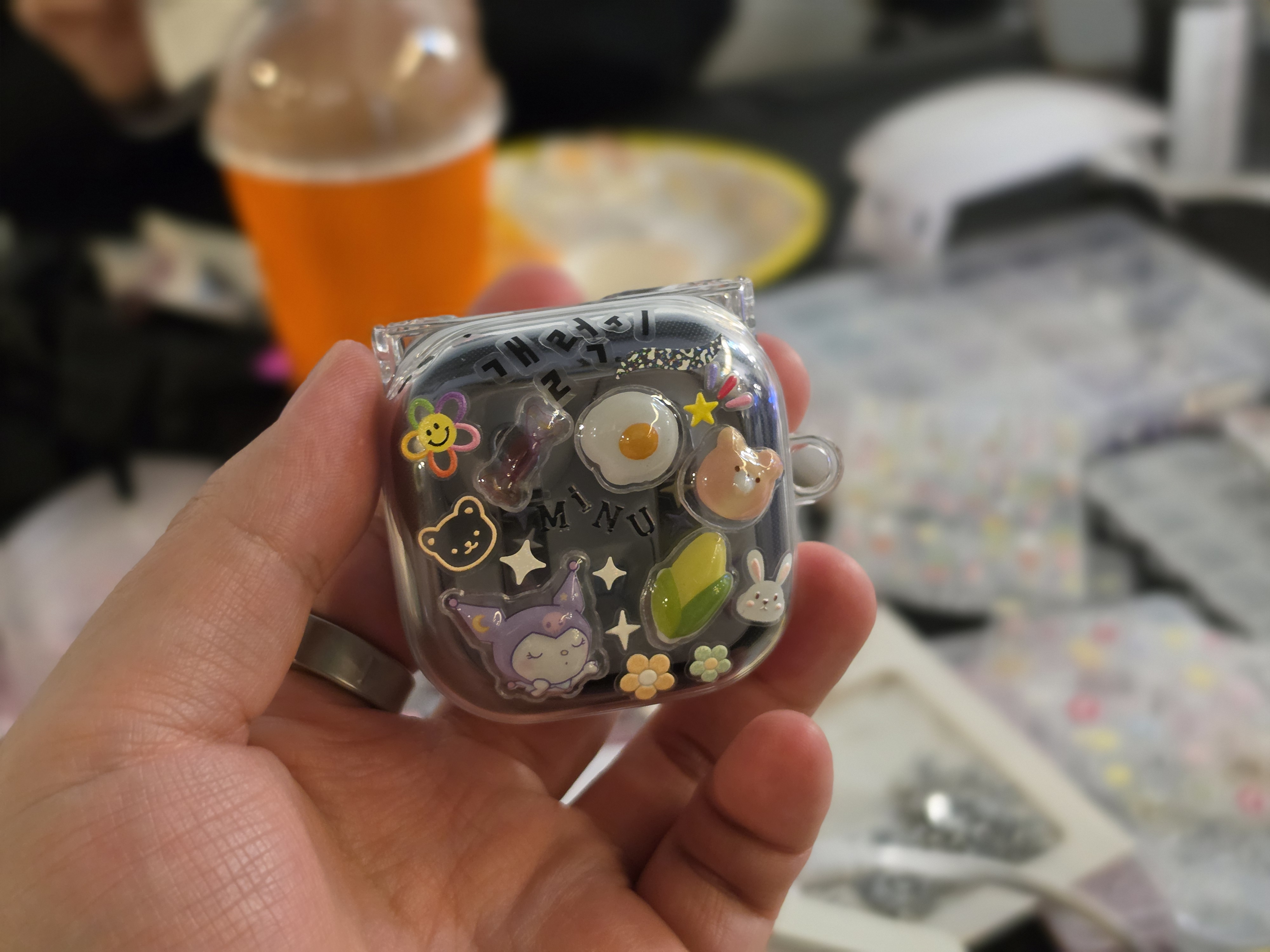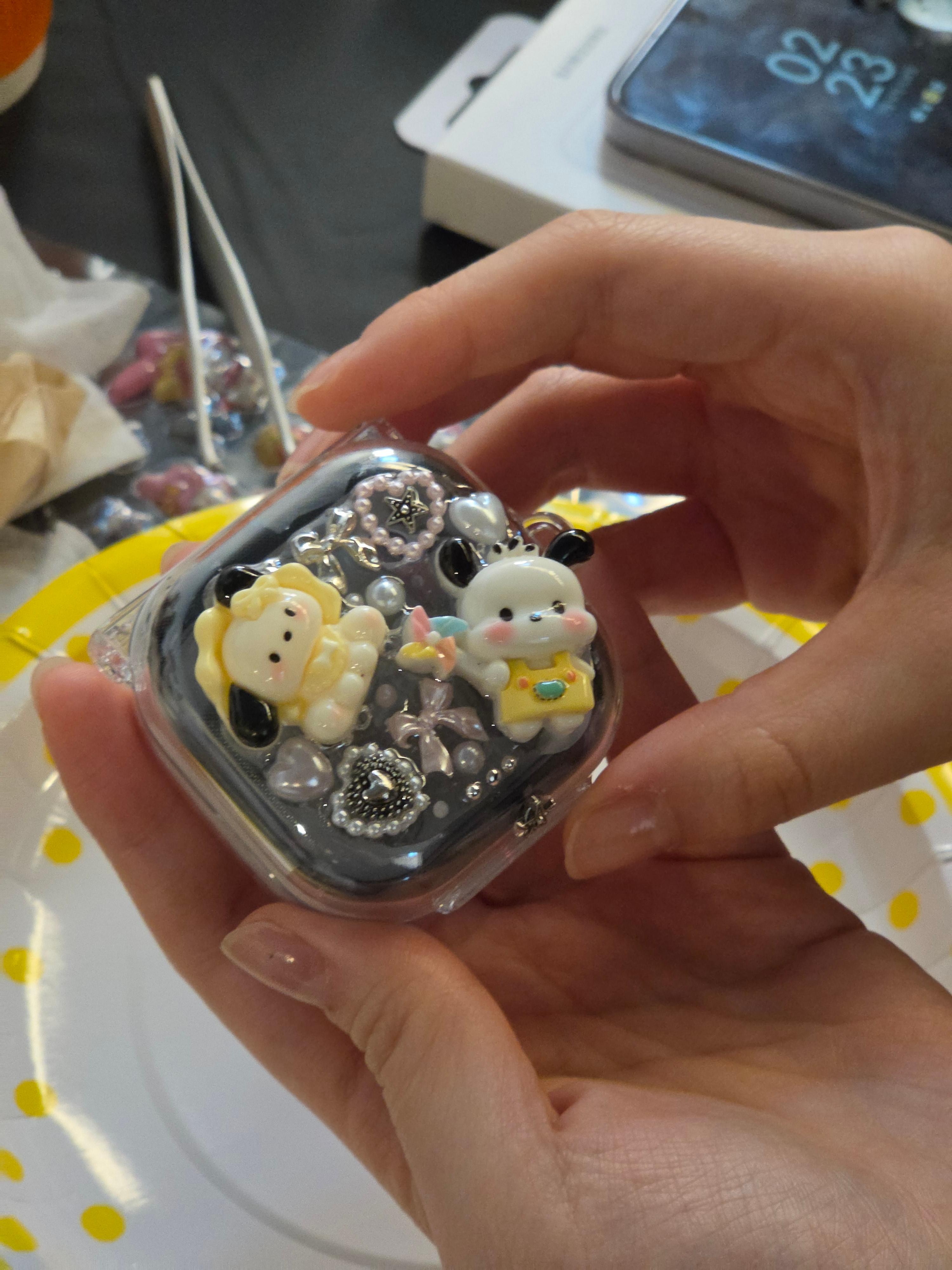 제 옆자리에서 부착전 엄청 고민하시고 레진 작업을 열심히 하시던 고구마옥수수님의 갤럭시버즈가 경화작업을 마치고 결과가 나왔는데요! 정말 시중에 판매하는 케이스 처럼 정말 예쁘게 잘 꾸미셨더라구요!