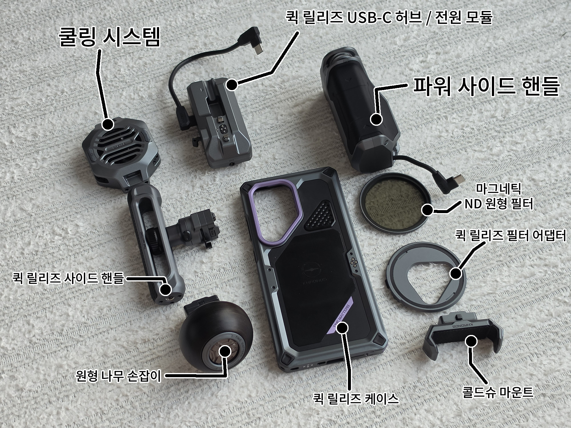 제가 체험해본 제품은 갤럭시 S26 울트라 용 틸타 크로노스 입니다, 구성품은 파워 사이드 핸들 / 쿨링 시스템 / 퀵 릴리즈 USB-C 허브,전원모듈 / 퀵 릴리즈 사이드 핸들 / 원형 나무 손잡이 / 퀵 릴리즈 케이스 / 콜드슈 마운트 / 퀵릴리즈 필터 어댑터 / 마그네틱 ND 원형 필터