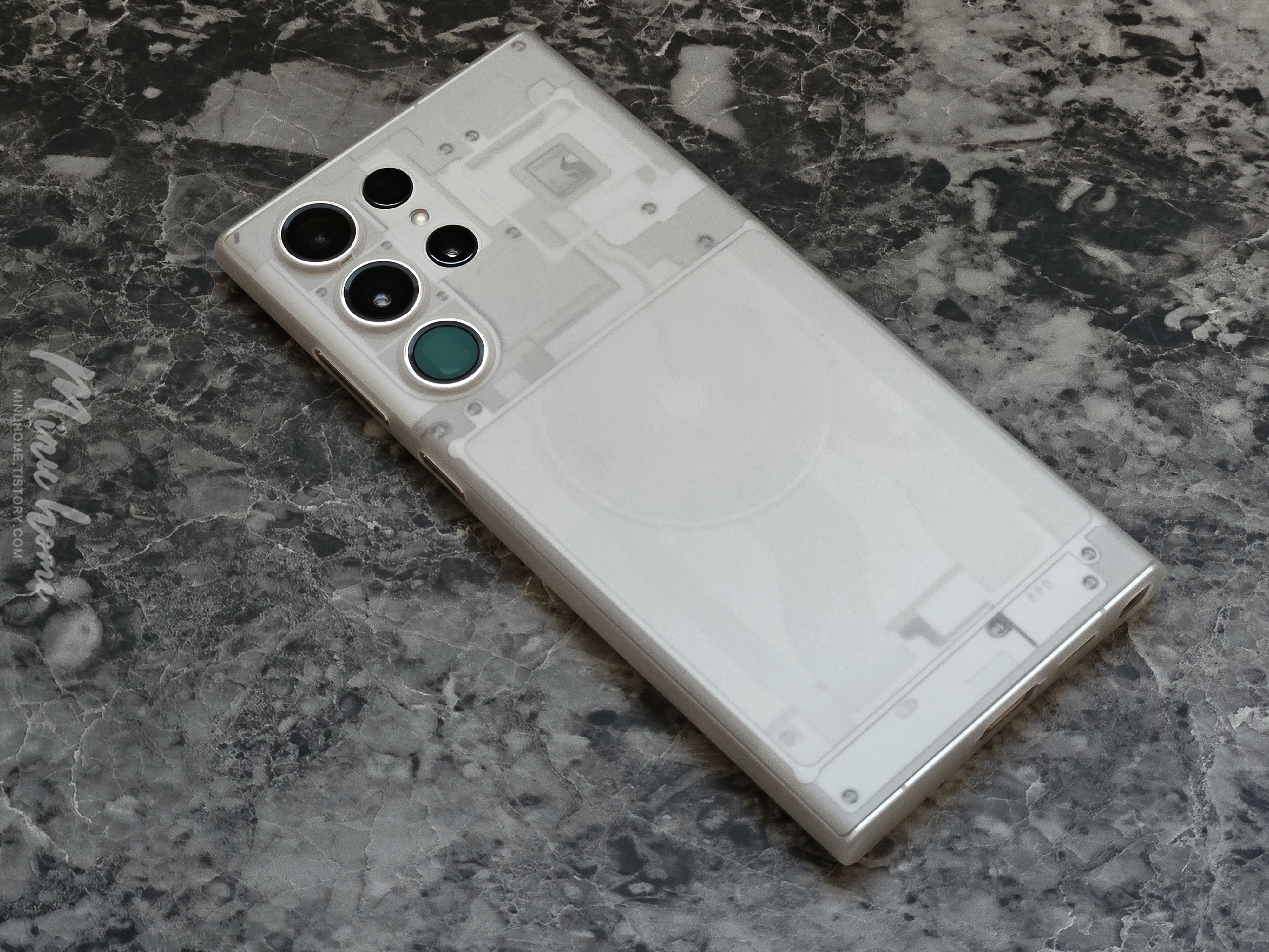 반투명 케이스를 착용하니 어느정도 미세하게 흐릿한 느낌이 들면서 입체감이 더 살아난거 같아 후면의 반투명 느낌을 보여주고 있습니다.